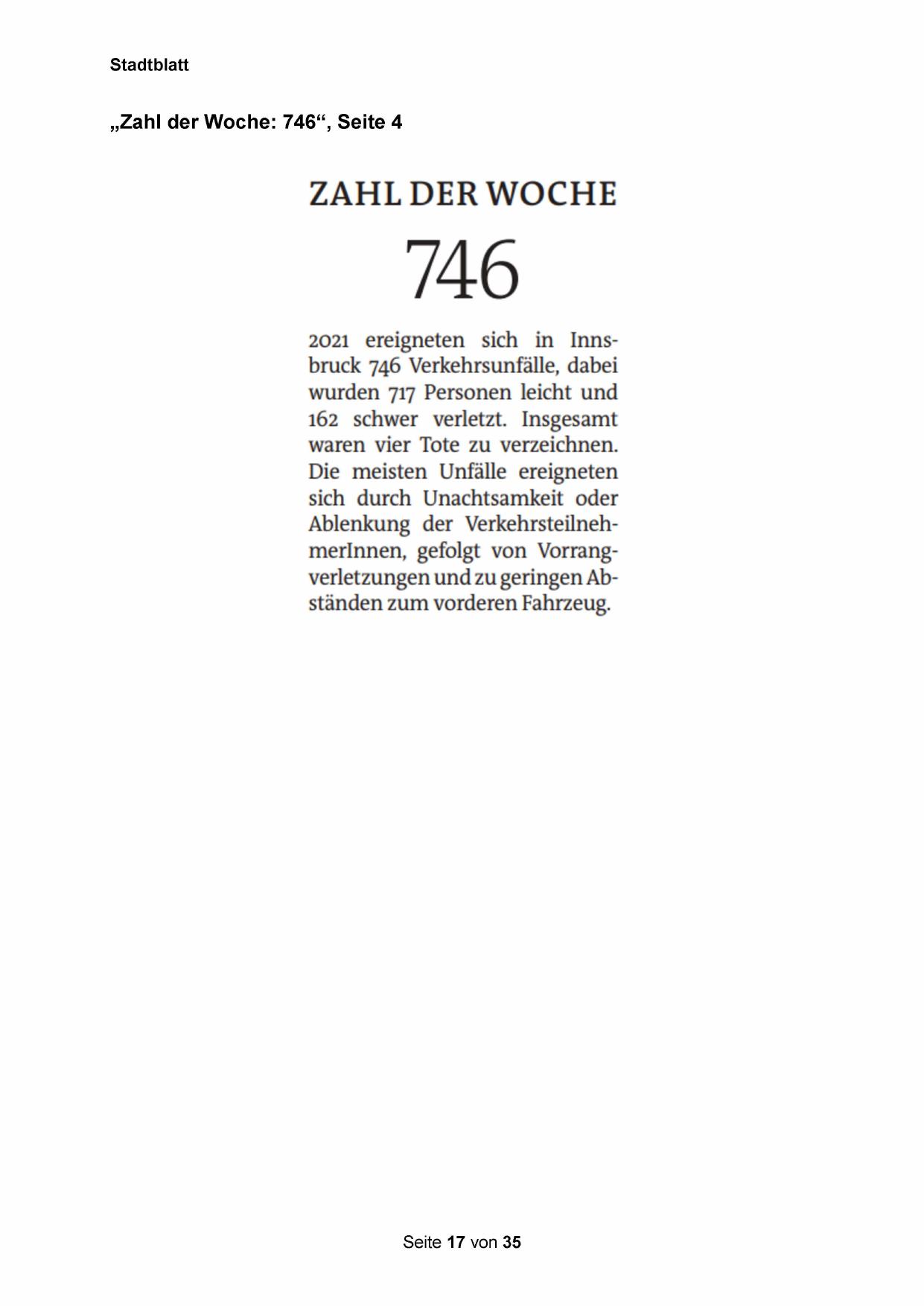 2021 ereigneten sich in Innsbruck 746 Verkehrsunfälle, dabei