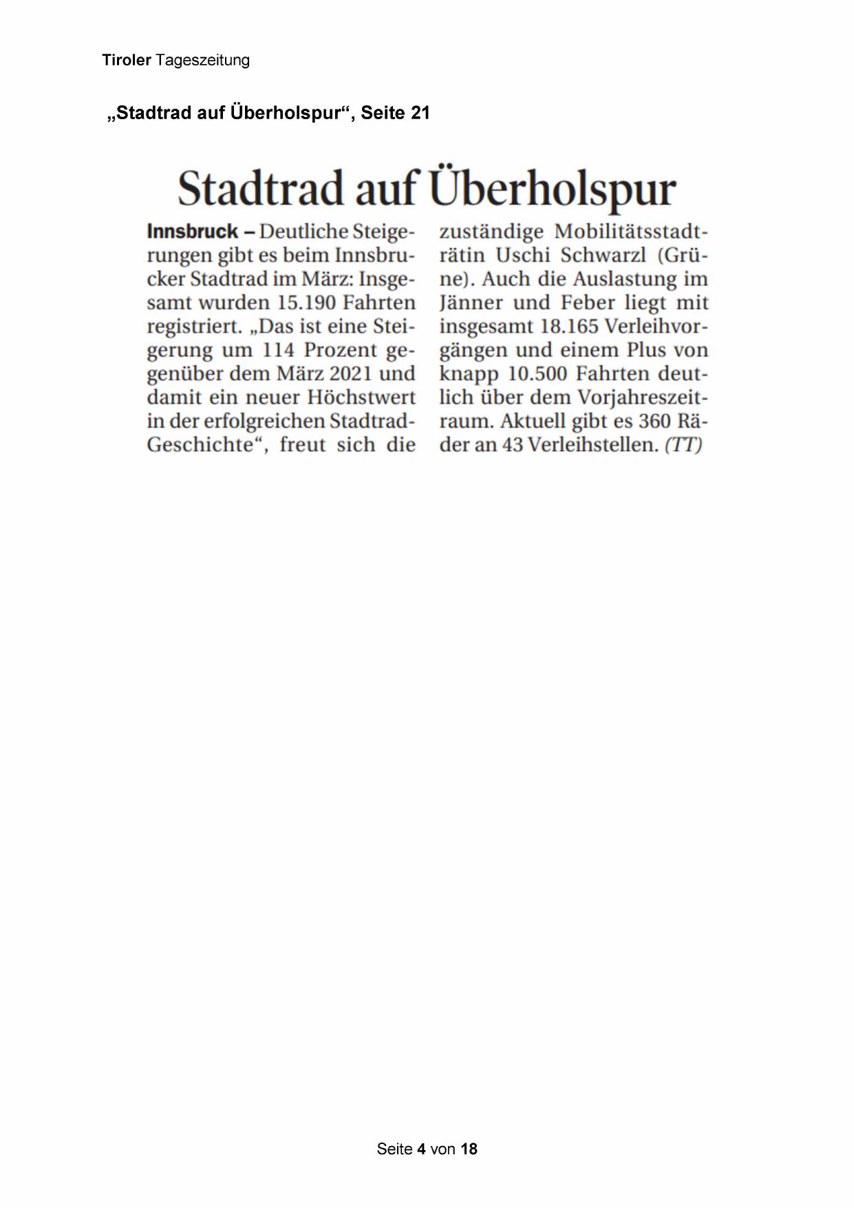 Innsbruck - Deutliche Steigerungen gibt es beim Innsbrucker Stadtrad im März: Insgesamt wurden 15.190 Fahrten