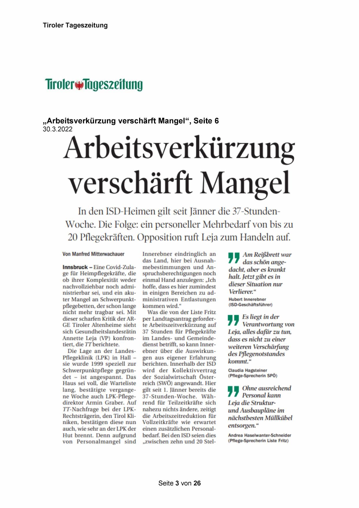 GE Tiroler Altenheime sieht te Arbeitszeitverkürzung auf Verantwortung von
