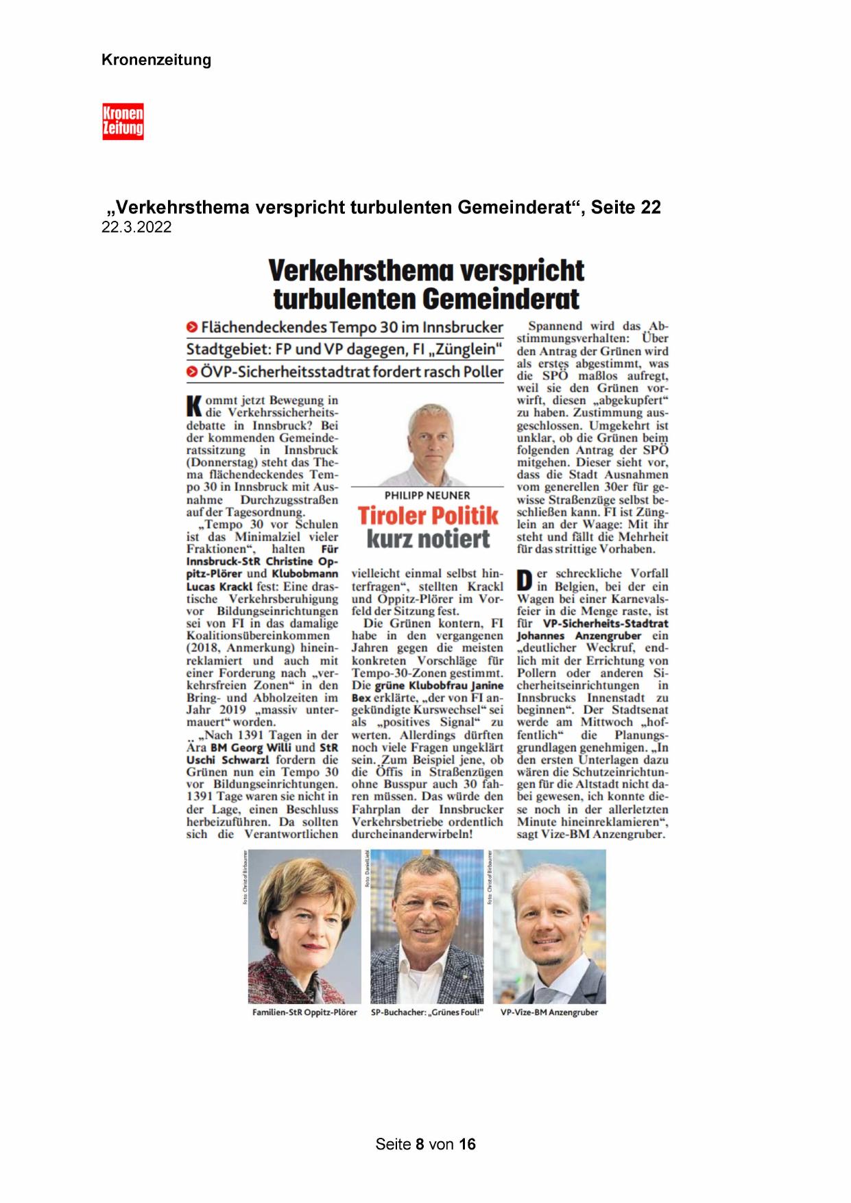 (Donnerstag) steht das Thema flächendeckendes Tempo 30 in Innsbruck mit Ausnahme Durchzugsstraßen