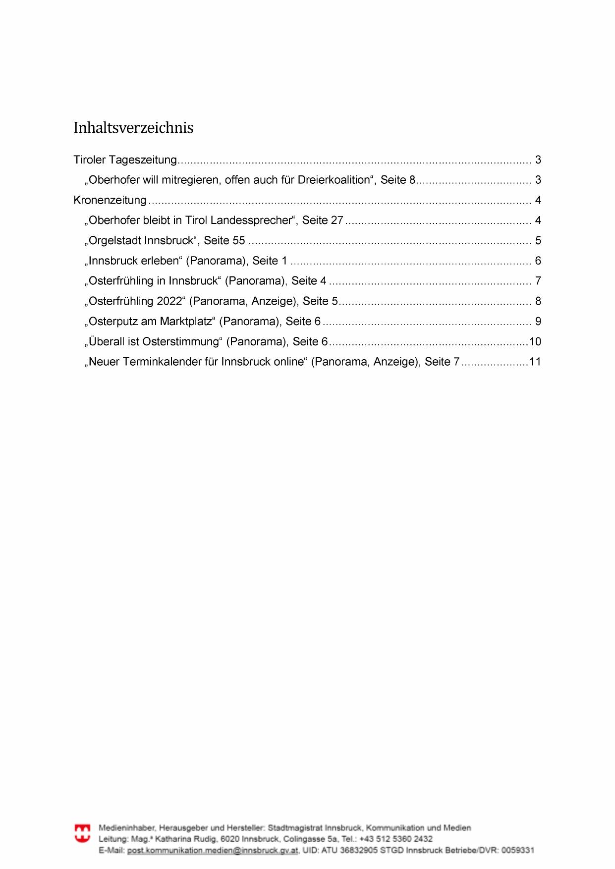 „Neuer Terminkalender für Innsbruck online“ (Panorama, Anzeige), Seite 7..................... 11