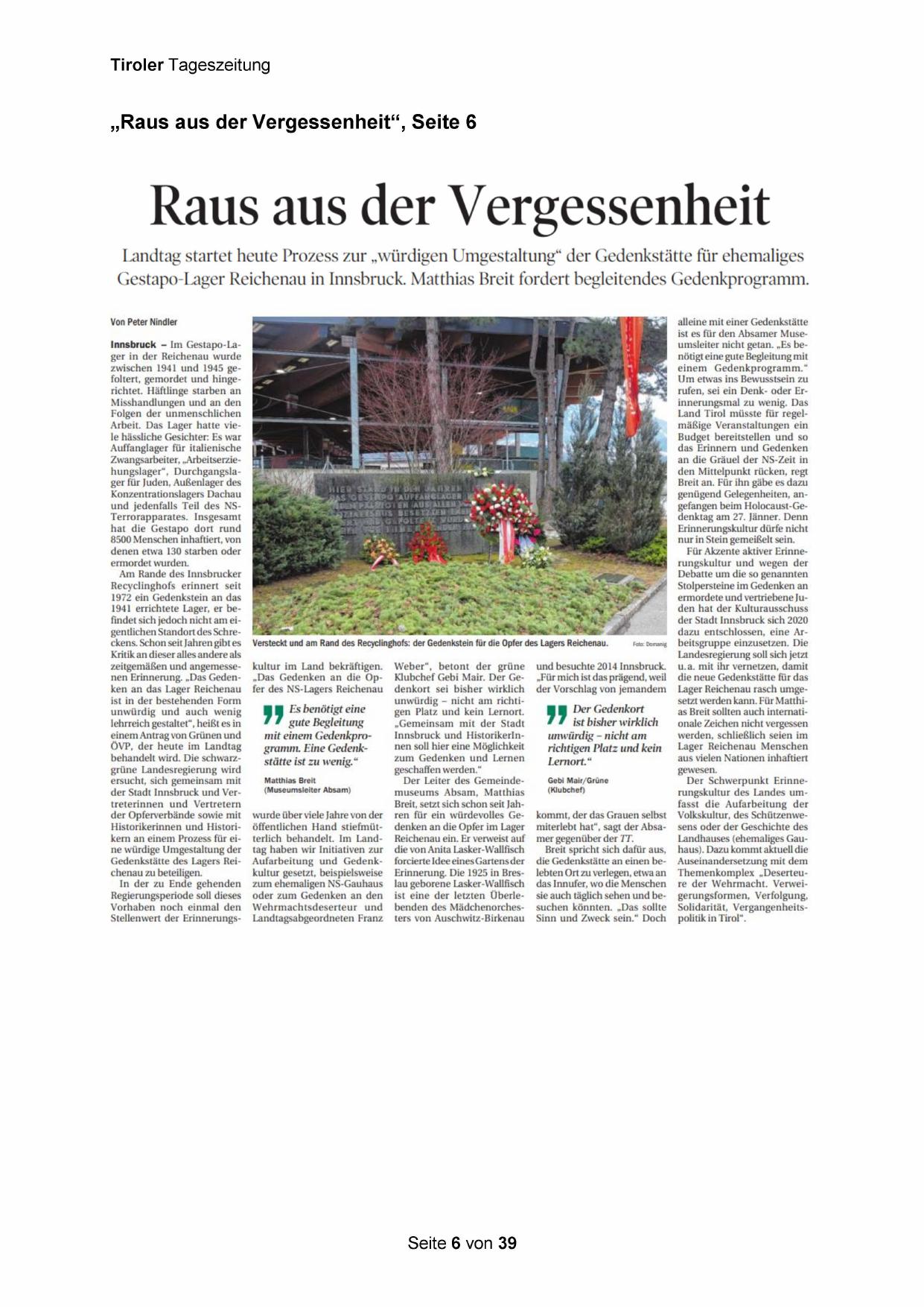 Gestapo-Lager Reichenau in Innsbruck. Matthias Breit fordert begleitendes Gedenkprogramm.