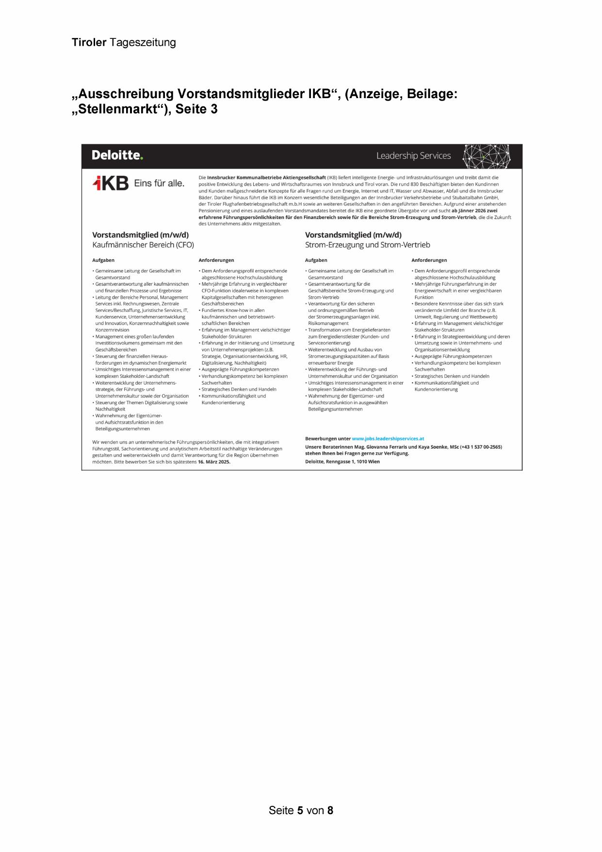 Pensionierung und eines auslaufenden Vorstandsmandates bereitet die IKB eine geordnete Übergabe vor und sucht ab Jänner 2026 zwei