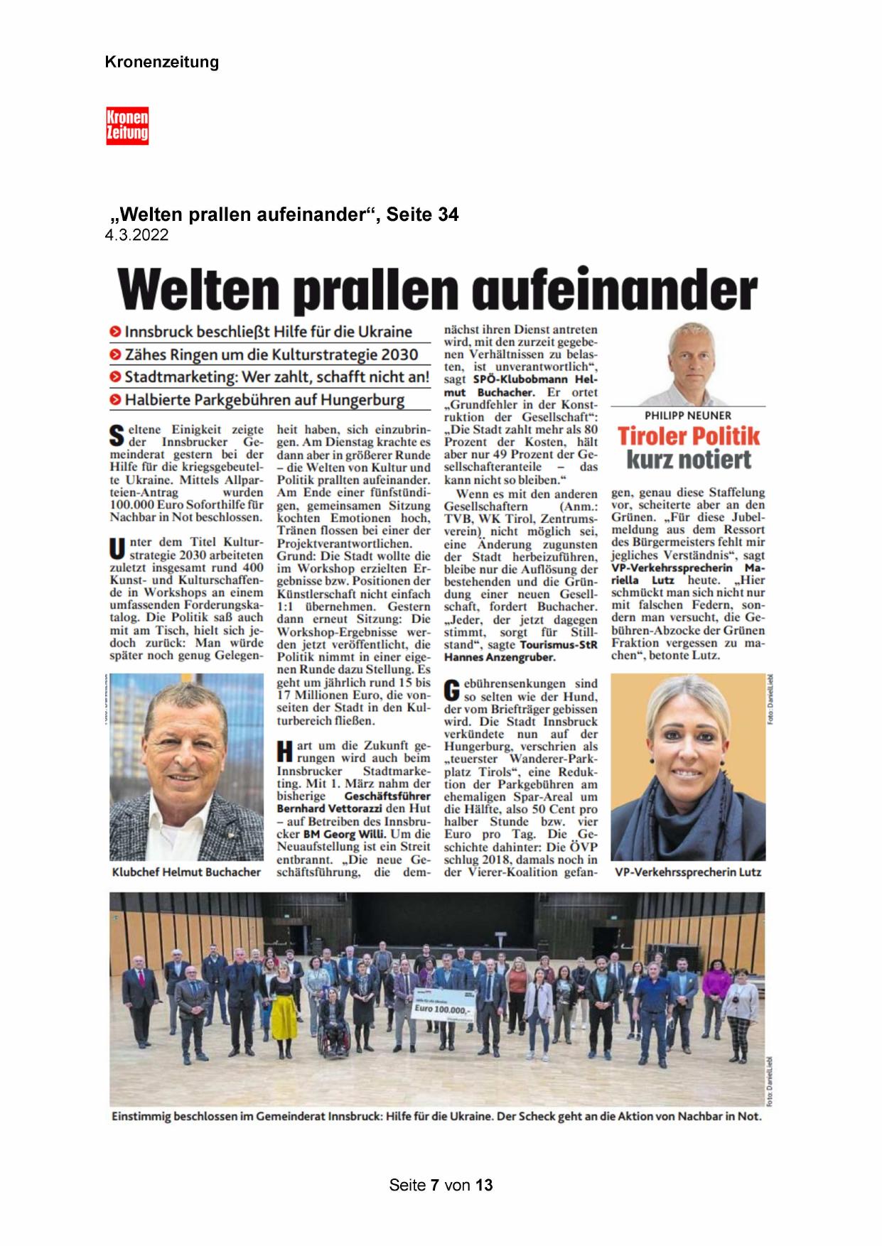 Einstimmig beschlossen im Gemeinderat Innsbruck: Hilfe für die Ukraine. Der Scheck geht an die Aktion von Nachbar in Not.