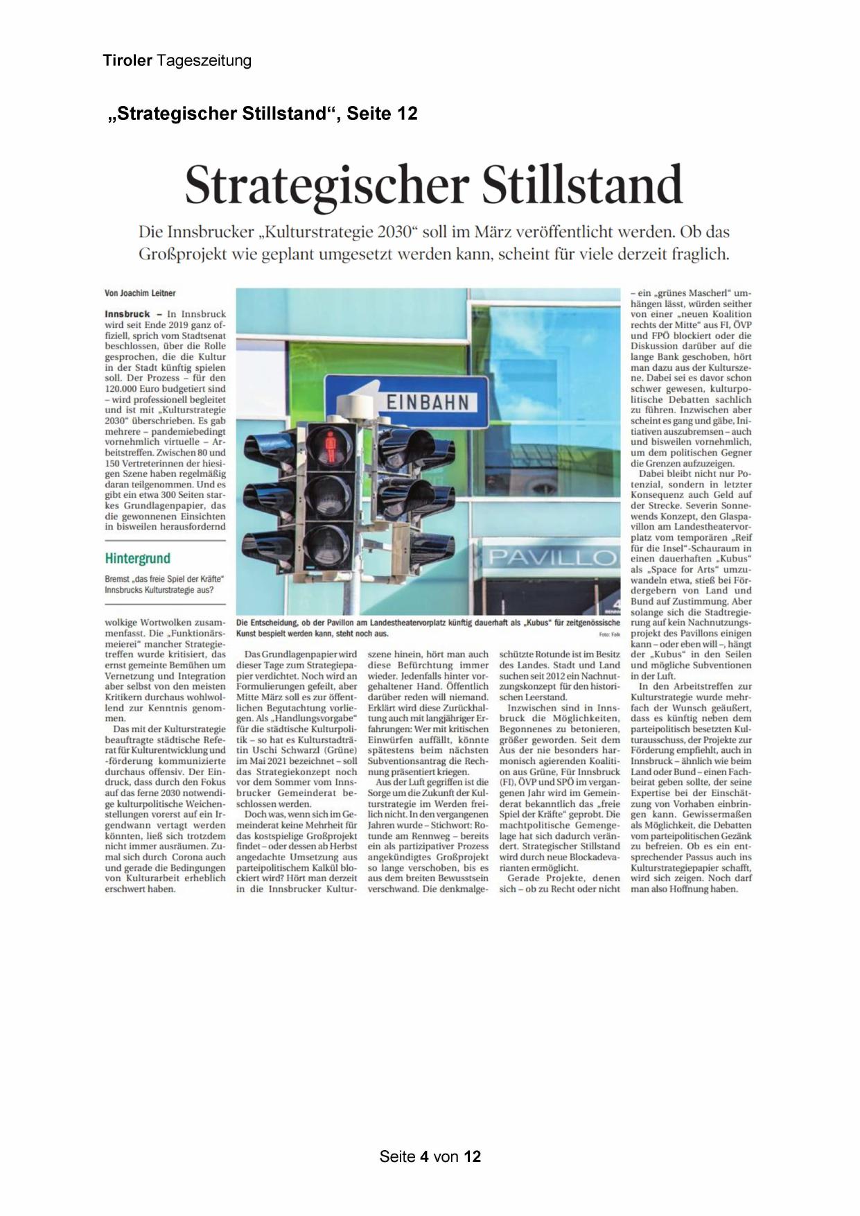 Die Innsbrucker „Kulturstrategie 2030“ soll im März veröffentlicht werden. Ob das