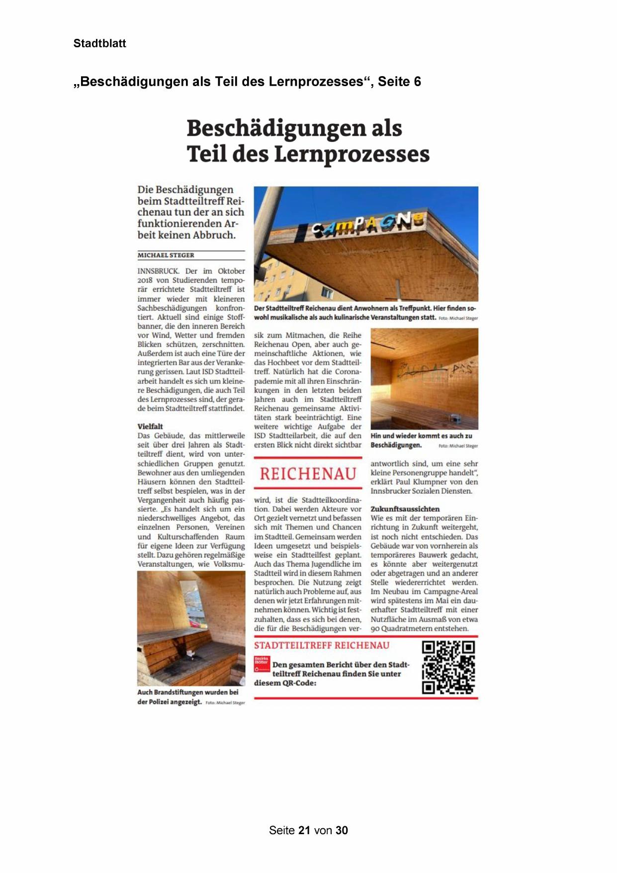 integrierten Bar aus der Verankerung gerissen. Laut ISD Stadtteilarbeit handelt es sich um kleinere Beschädigungen, die auch Teil