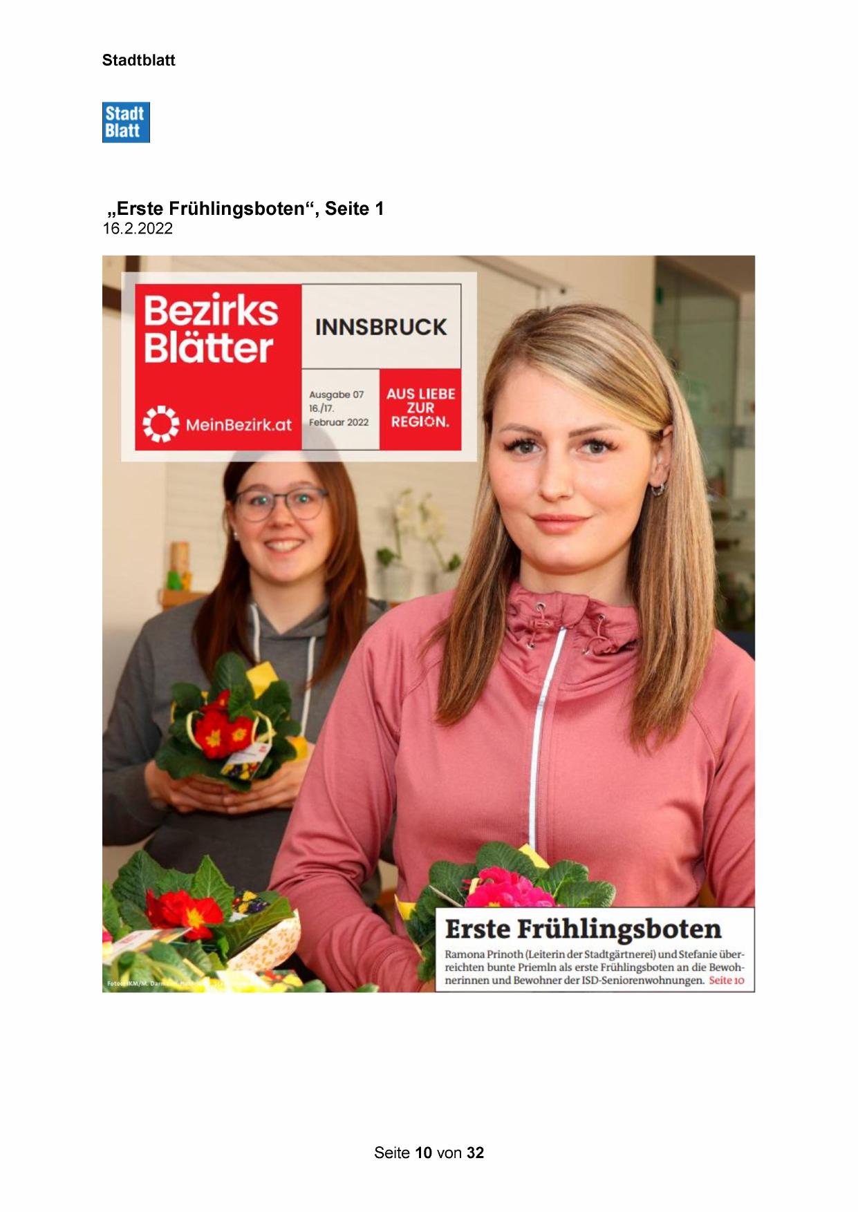 Ramona Prinoth (Leiterin der Stadtgärtnerei) und Stefanie überreichten bunte Priemin als erste Frühlingsboten an die Bewohnerinnen und Bewohner der ISD-Seniorenwohnungen. Seite 10