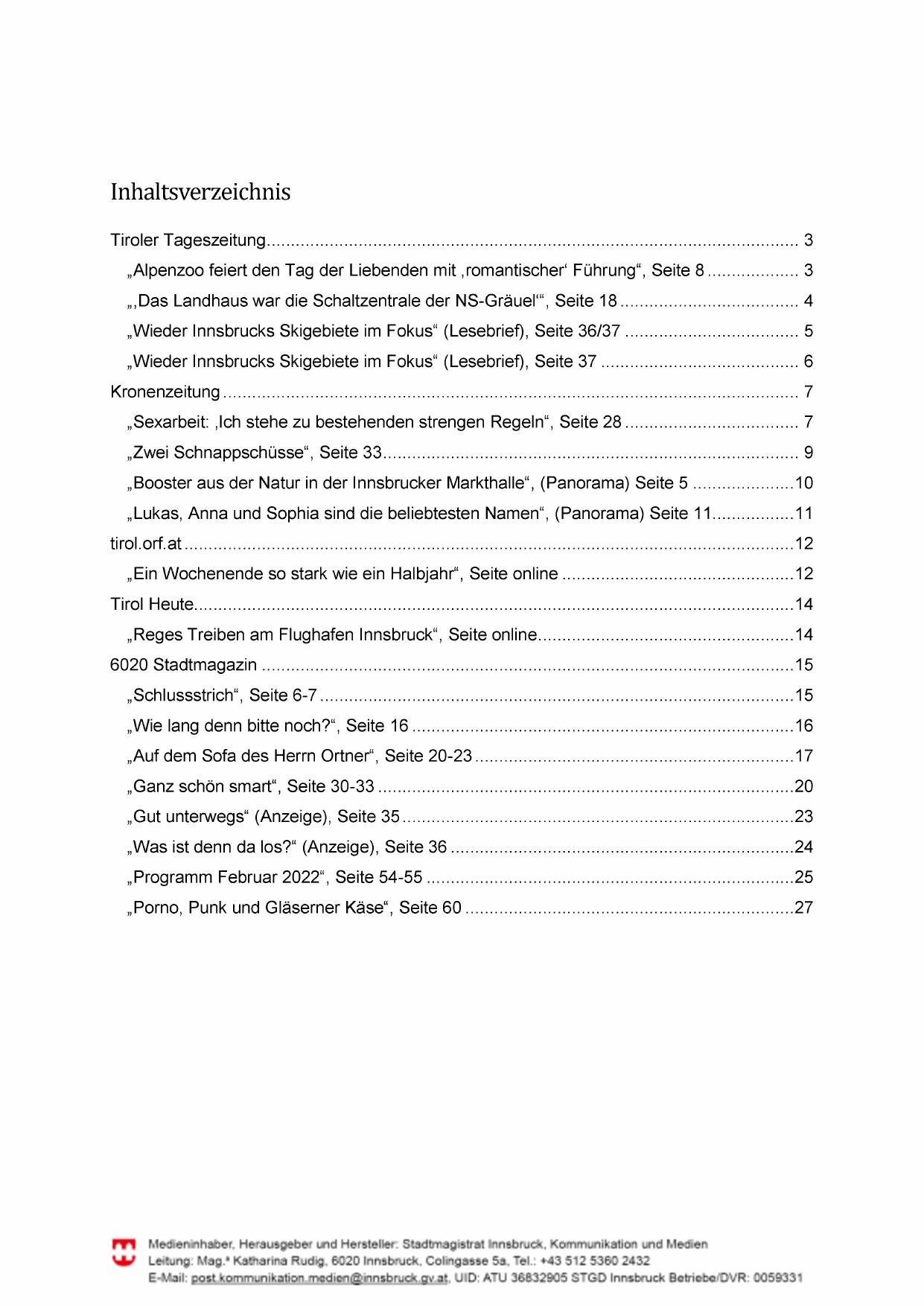 „Alpenzoo feiert den Tag der Liebenden mit ‚romantischer‘ Führung“, Seite 8................... 3