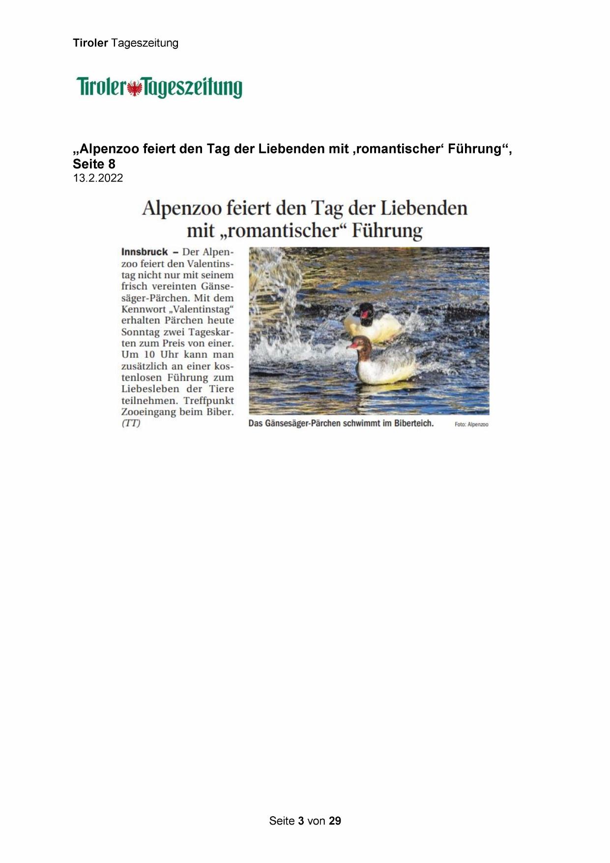 „Alpenzoo feiert den Tag der Liebenden mit ‚romantischer‘ Führung“,