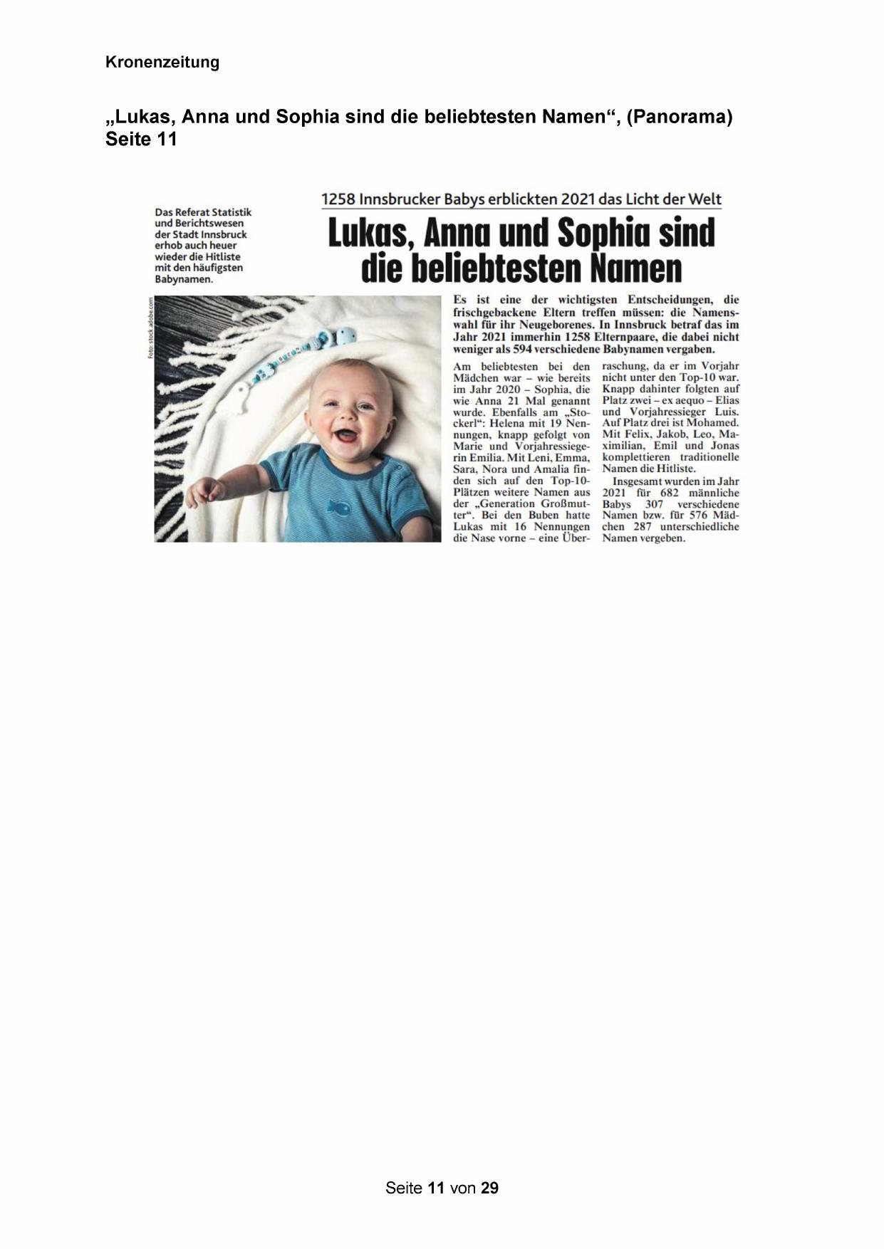 „Lukas, Anna und Sophia sind die beliebtesten Namen“, (Panorama)