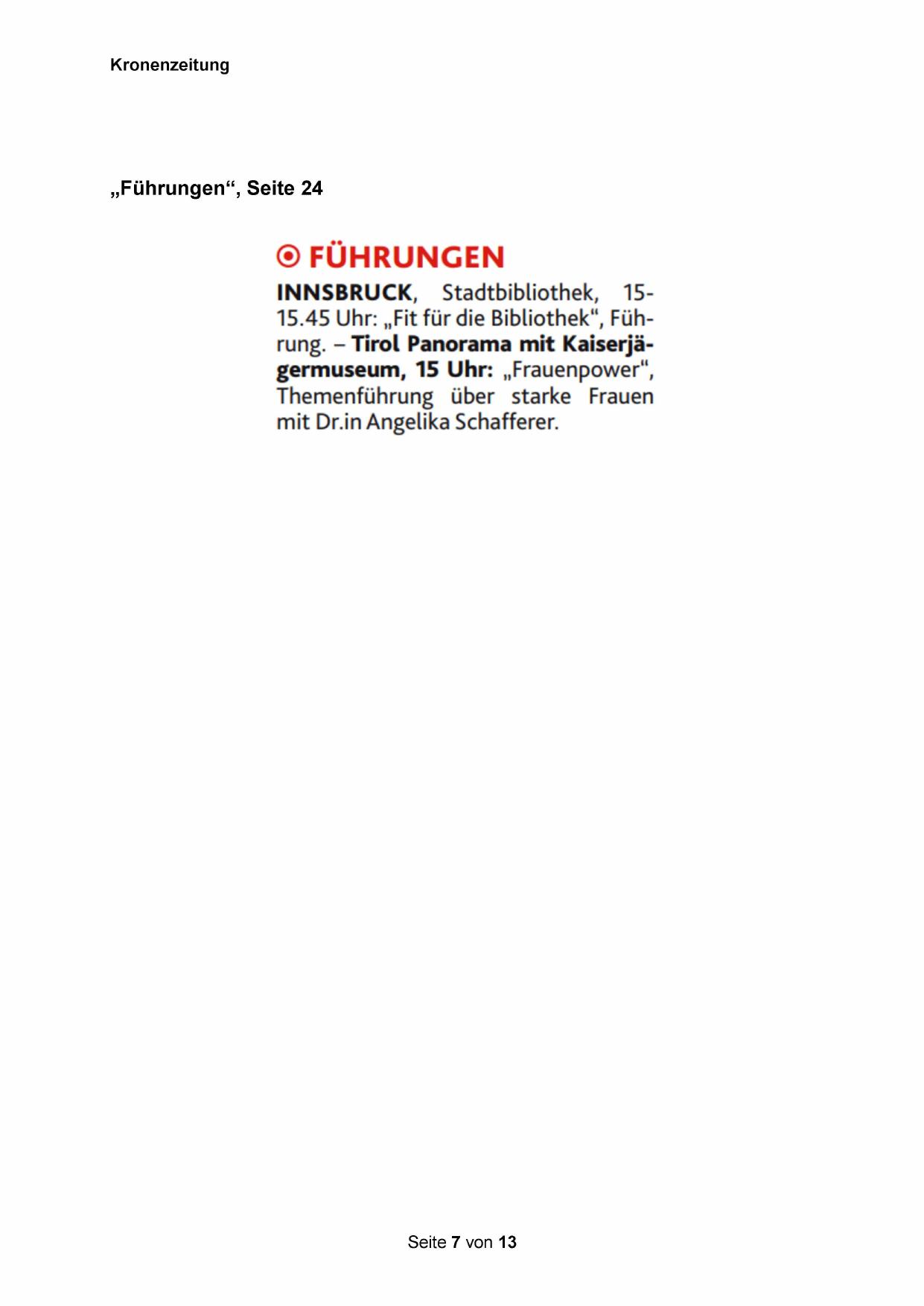 15.45 Uhr: „Fit für die Bibliothek“, Führung. - Tirol Panorama mit Kaiserjägermuseum, 15 Uhr: „Frauenpower“,