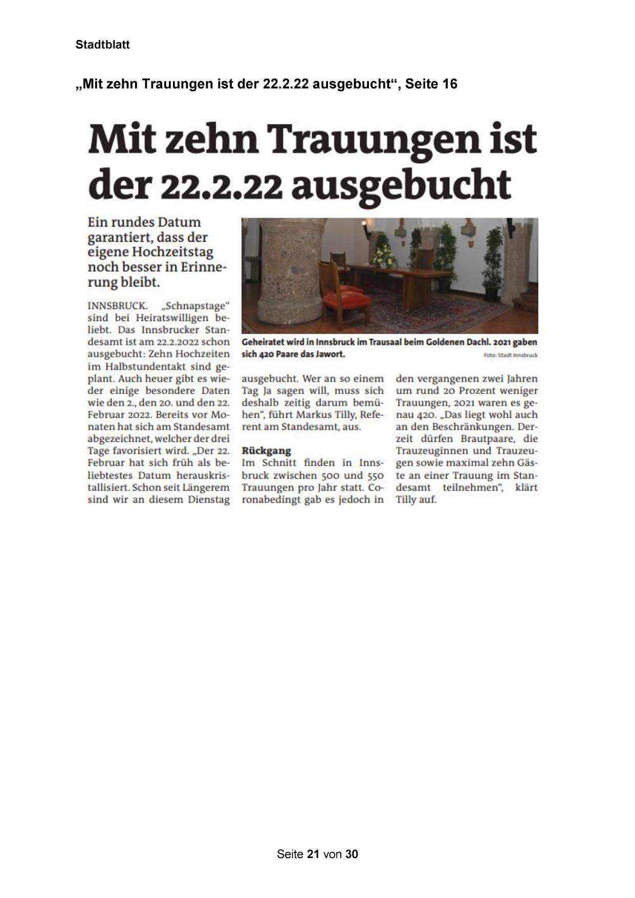 sind bei Heiratswilligen beliebt. Das Innsbrucker Standesamt ist am 22.2.2022 schon