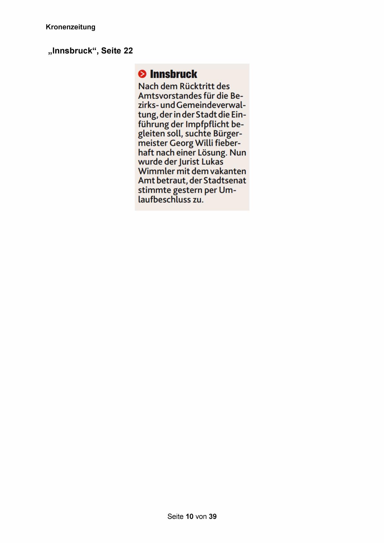 Amtsvorstandes für die Bezirks- und Gemeindeverwaltung, der in der Stadt die Einführung der Impfpflicht begleiten soll, suchte Bürgermeister Georg Willi fieberhaft nach einer Lösung. Nun