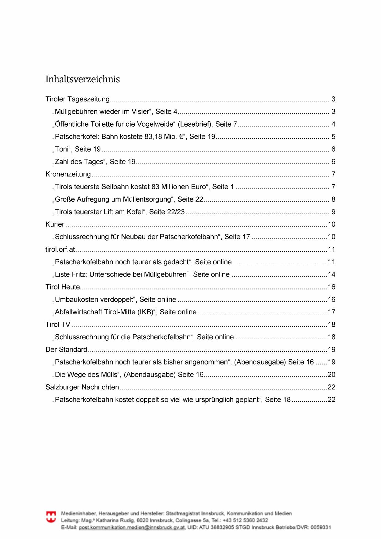„Patscherkofelbahn noch teurer als bisher angenommen“, (Abendausgabe) Seite 16 ...... 19