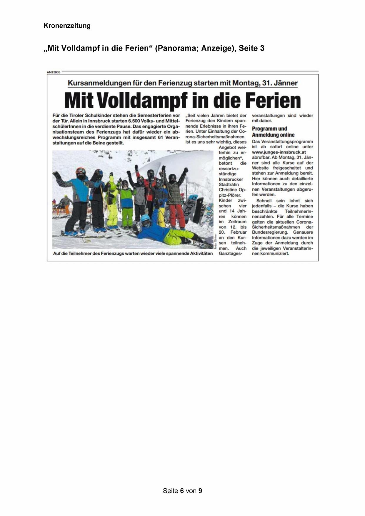 der Tür. Allein in Innsbruck starten 6.500 Volks- und MittelschülerInnen in die verdiente Pause. Das engagierte Organisationsteam des Ferienzugs hat dafür wieder ein abwechslungsreiches Programm mit insgesamt 61 Veranstaltungen auf die Beine gestellt.