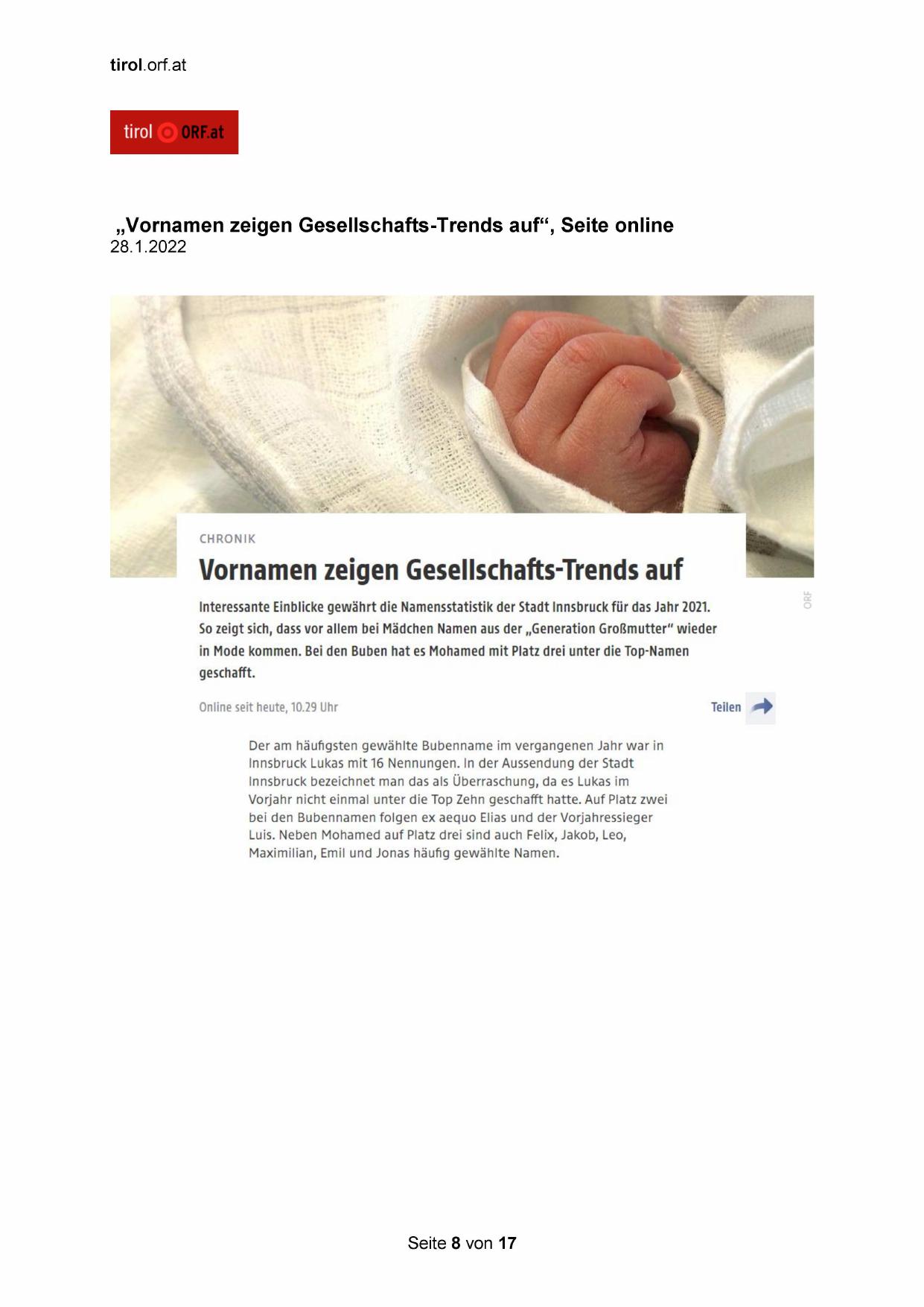„Vornamen zeigen Gesellschafts-Trends auf“, Seite online