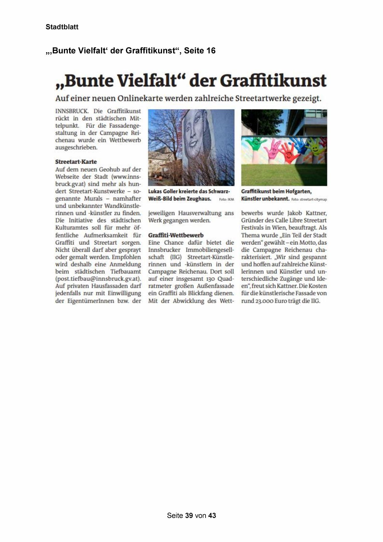 Webseite der Stadt (www.innsbruck.gv.at) sind mehr als hundert Streetart-Kunstwerke — sogenannte Murals —- namhafter