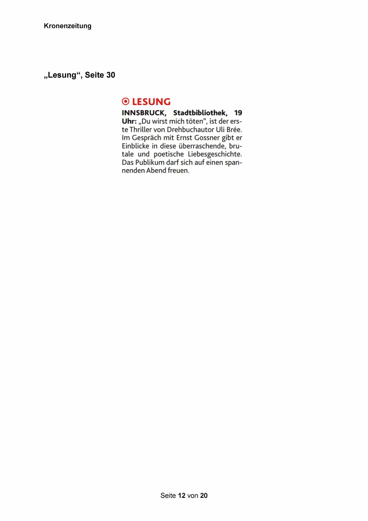 Uhr: „Du wirst mich töten“, ist der erste Thriller von Drehbuchautor Uli Bree.