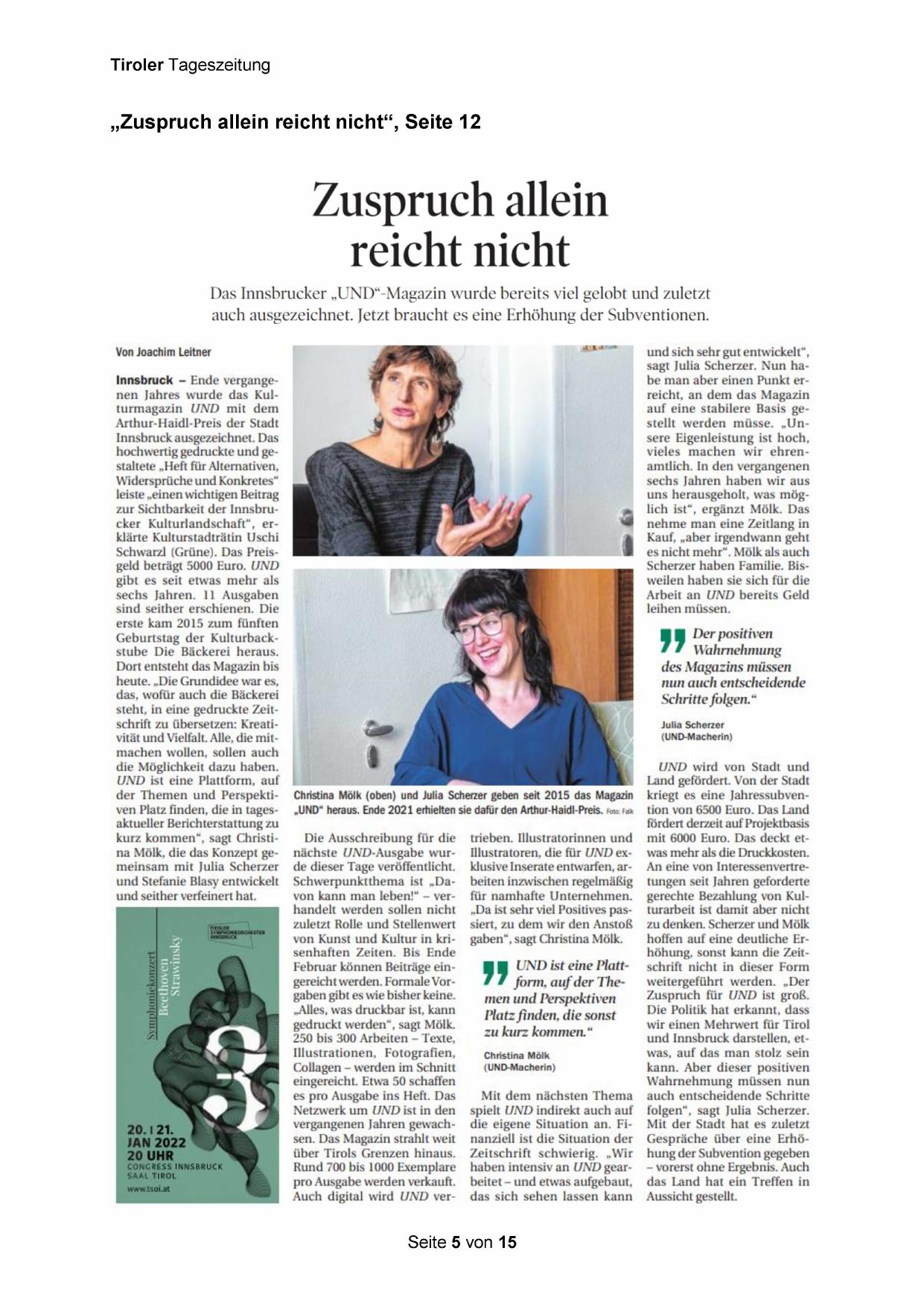 „UND“ heraus. Ende 2021 erhielten sie dafür den Arthur-Haidl-Preis. fow: Fa