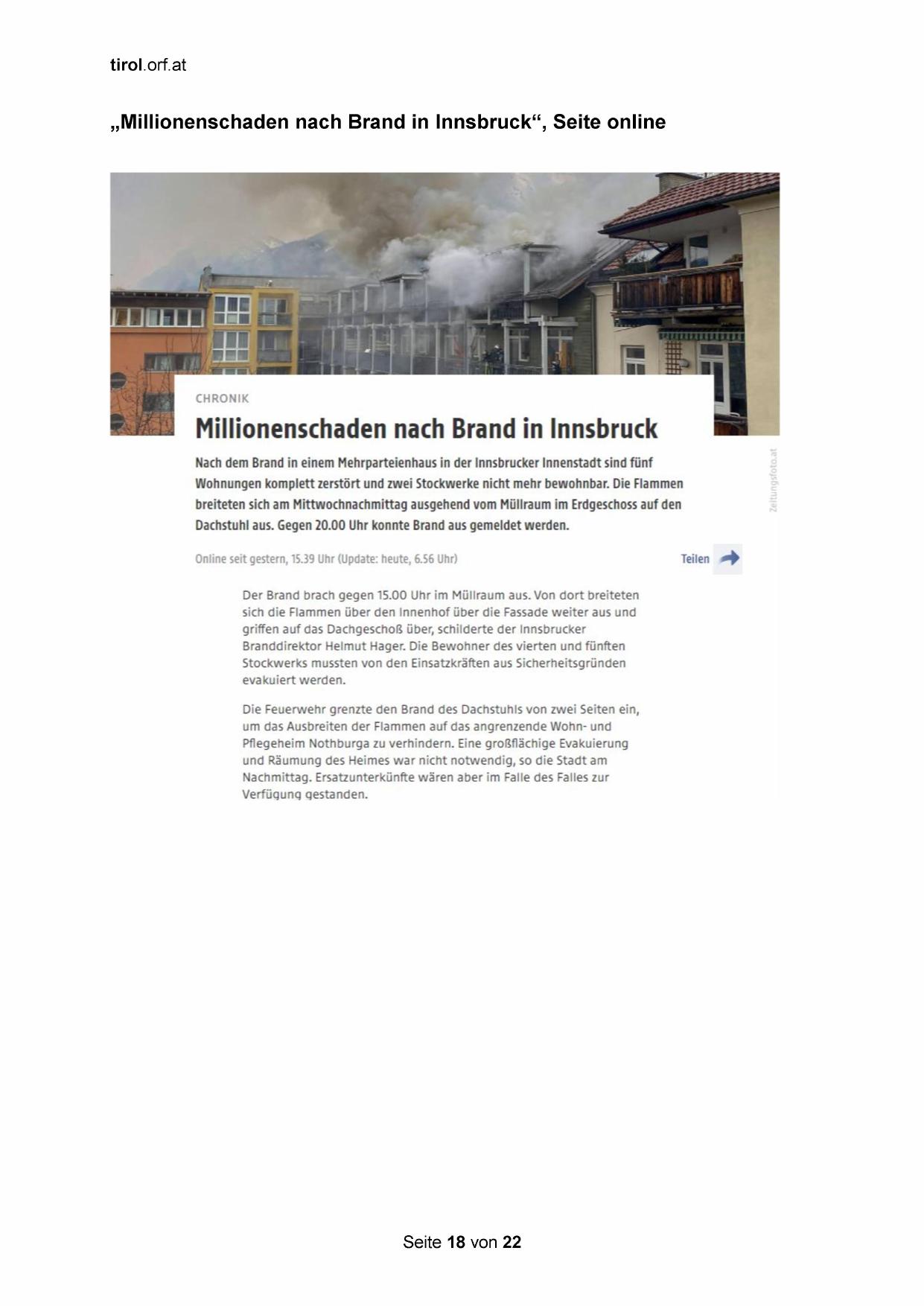 „Millionenschaden nach Brand in Innsbruck“, Seite online