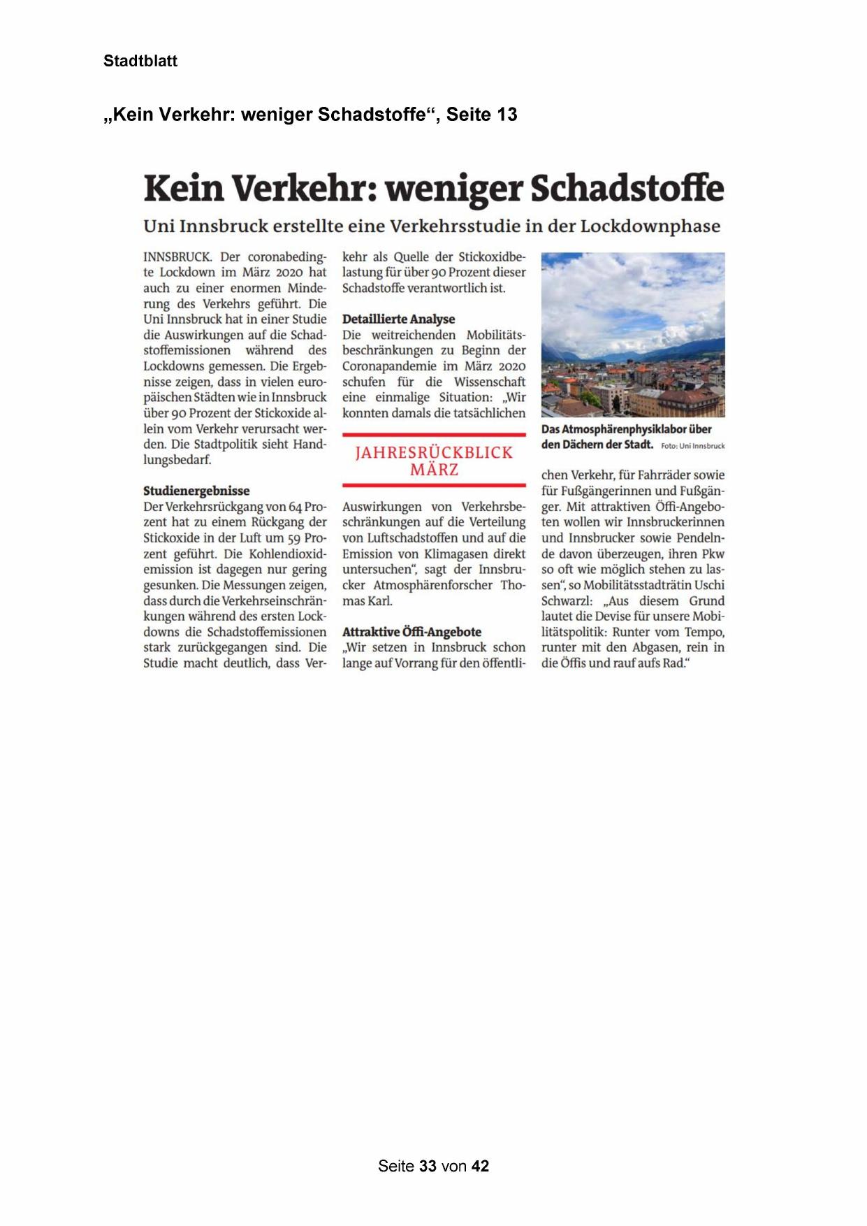 Uni Innsbruck erstellte eine Verkehrsstudie in der Lockdownphase