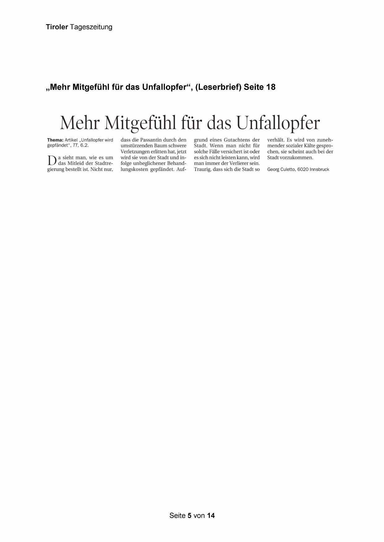 „Mehr Mitgefühl für das Unfallopfer“, (Leserbrief) Seite 18