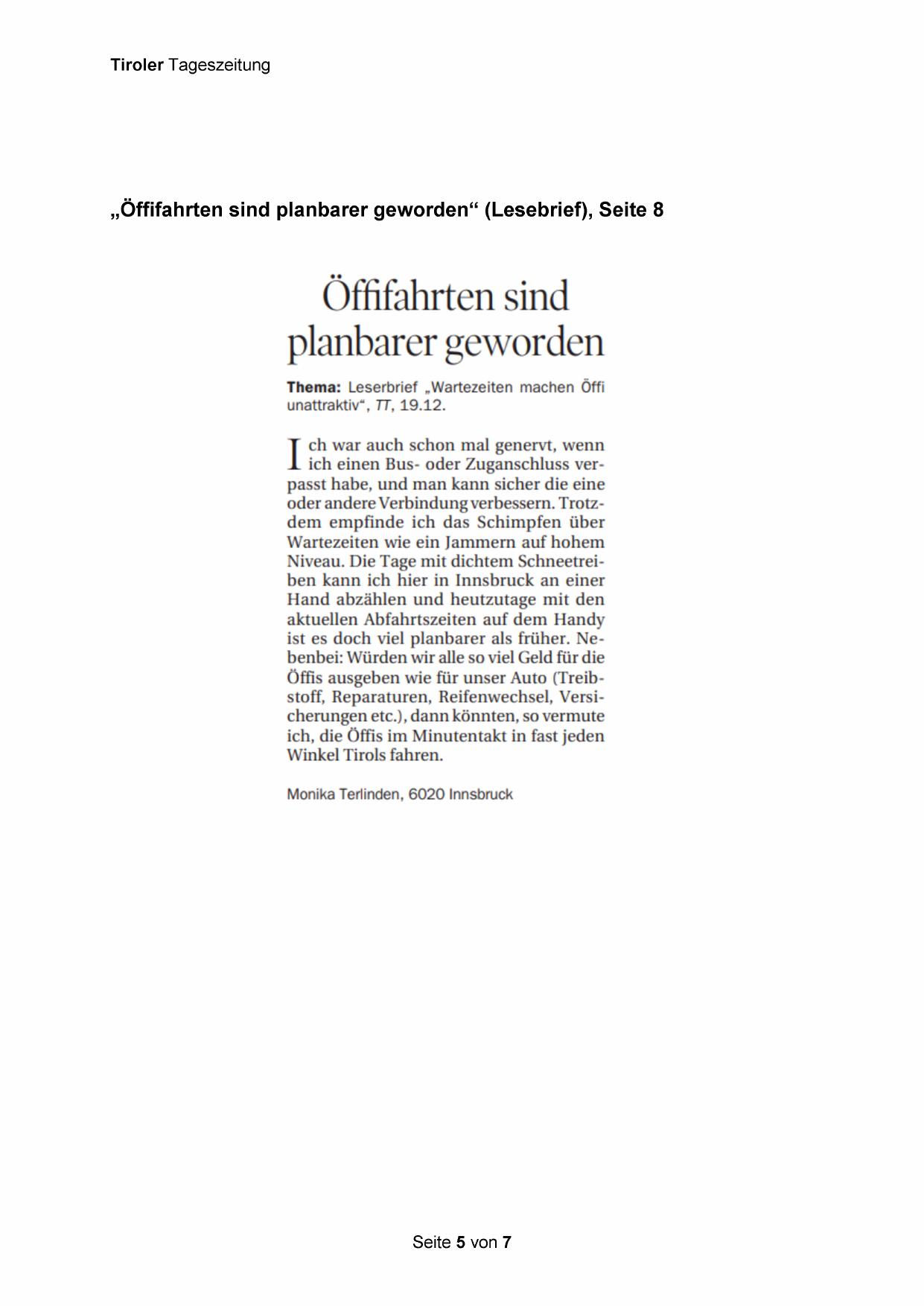 „Öffifahrten sind planbarer geworden“ (Lesebrief), Seite 8