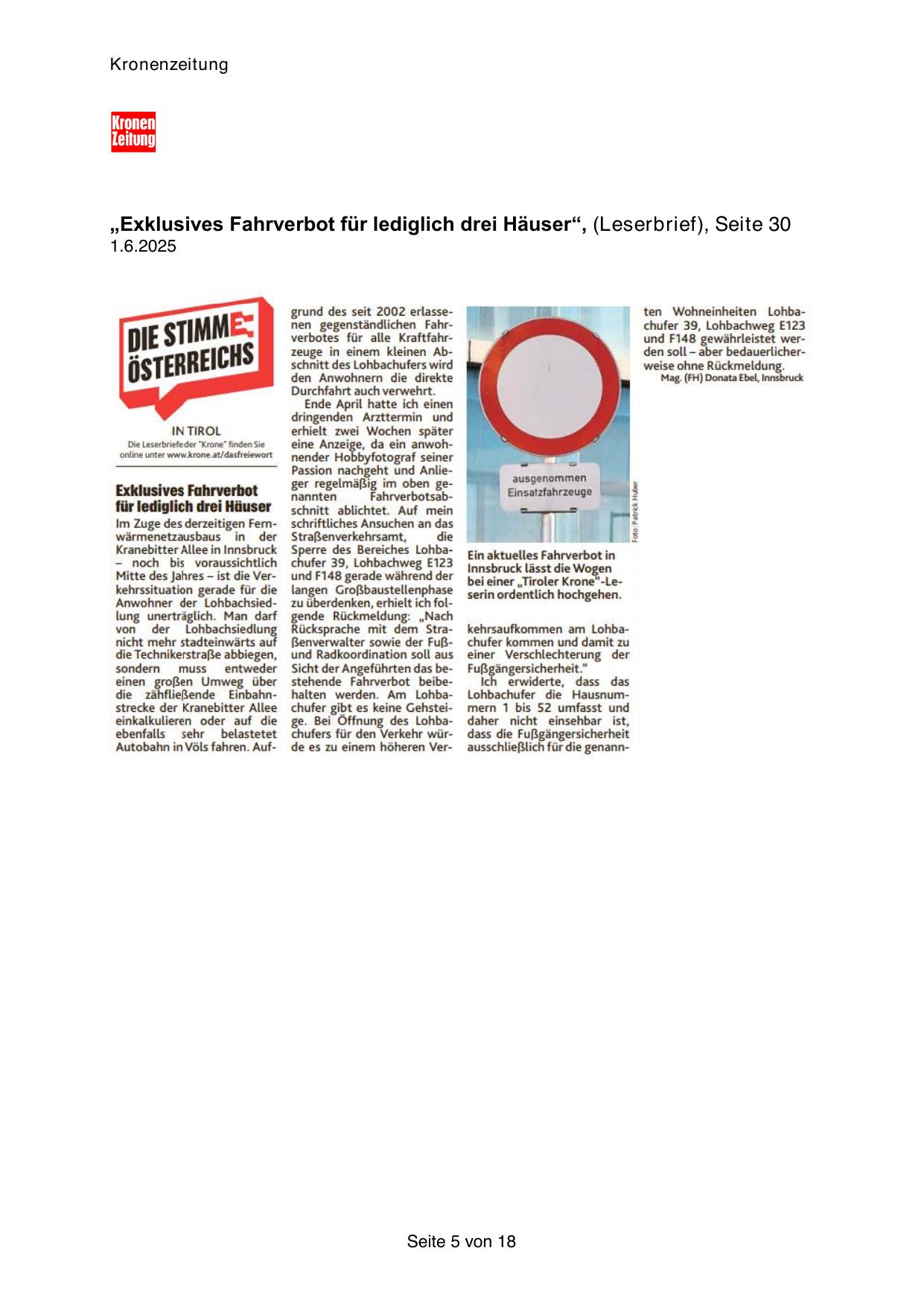 „Exklusives Fahrverbot für lediglich drei Häuser“, (Leserbrief), Seite 30
