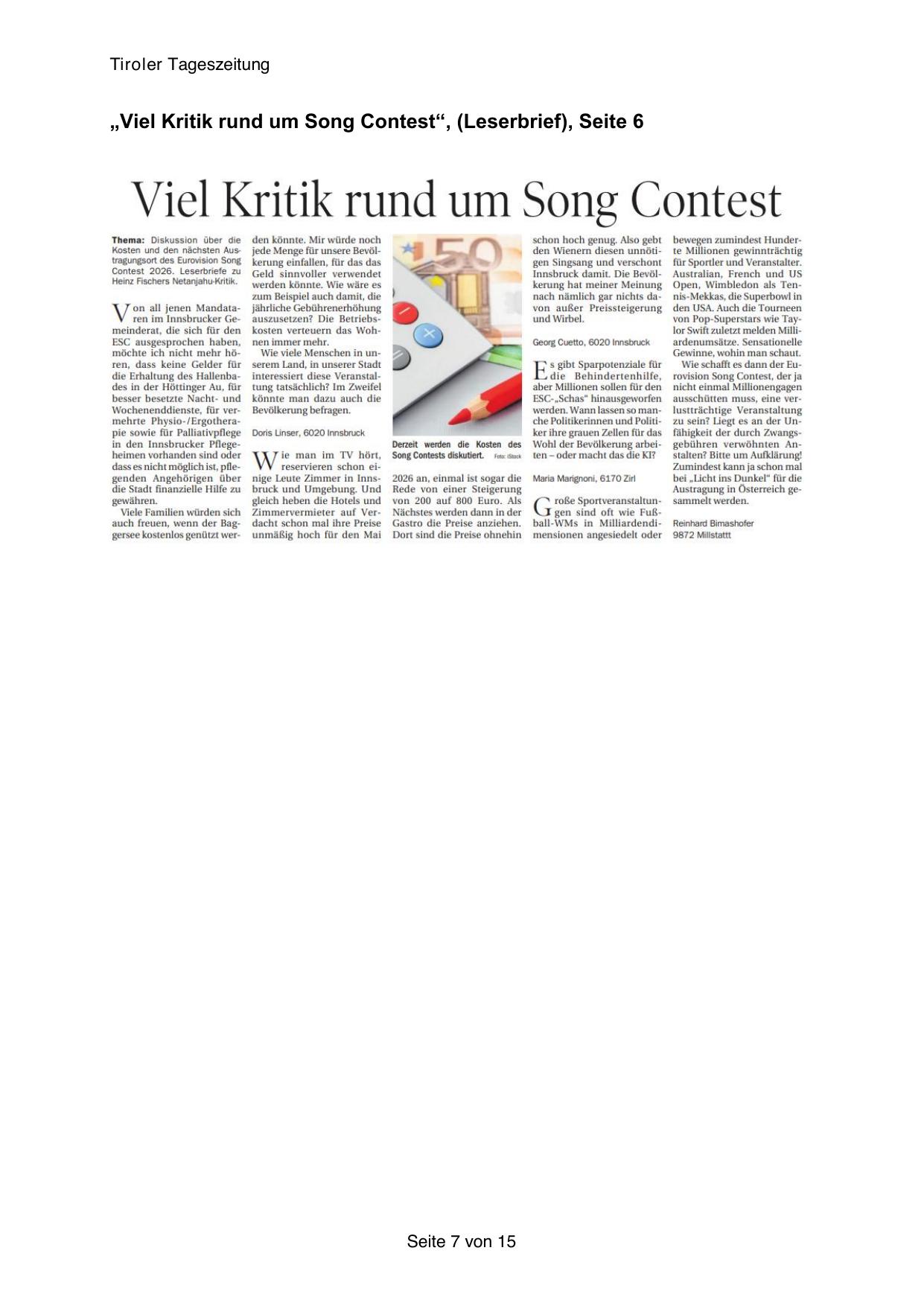 „Viel Kritik rund um Song Contest“, (Leserbrief), Seite 6