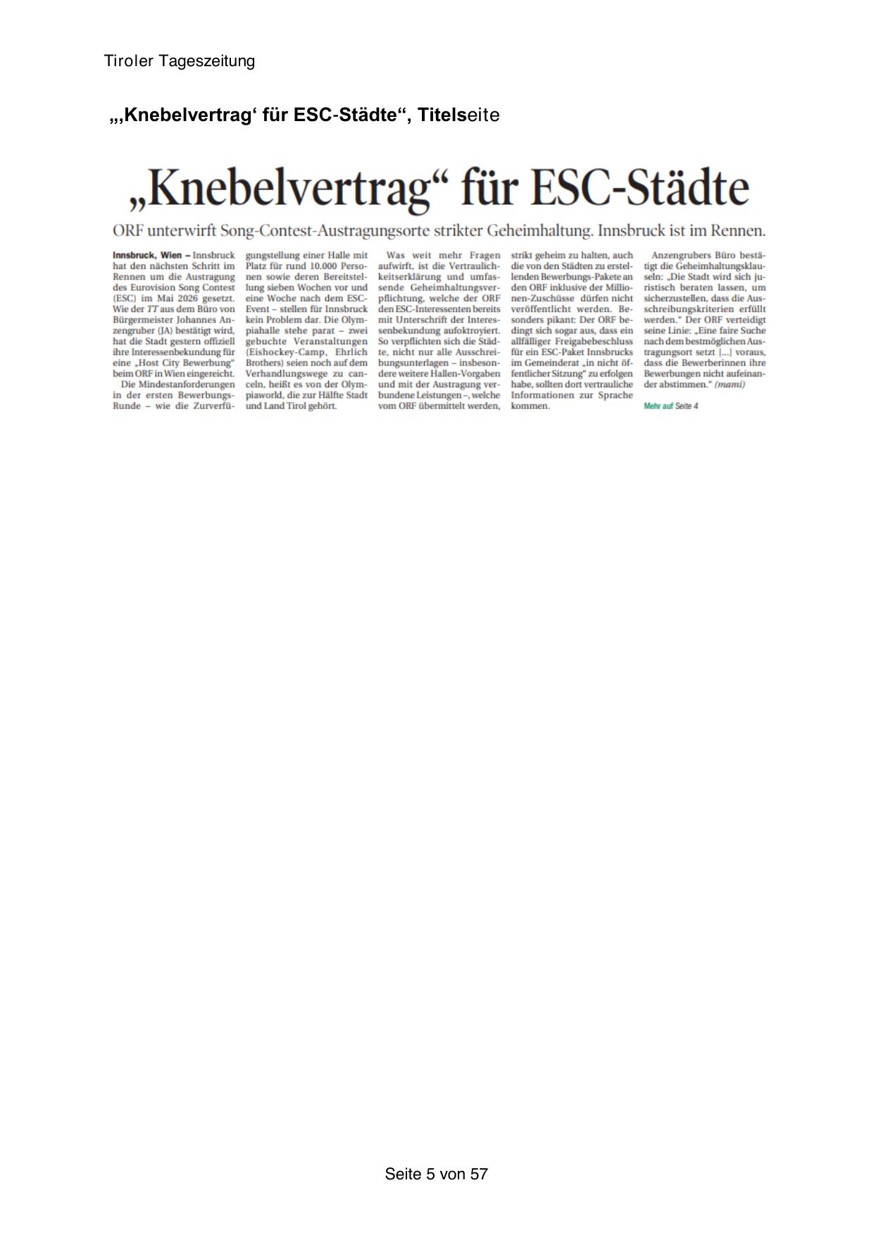 „‚Knebelvertrag‘ für ESC-Städte“, Titelseite