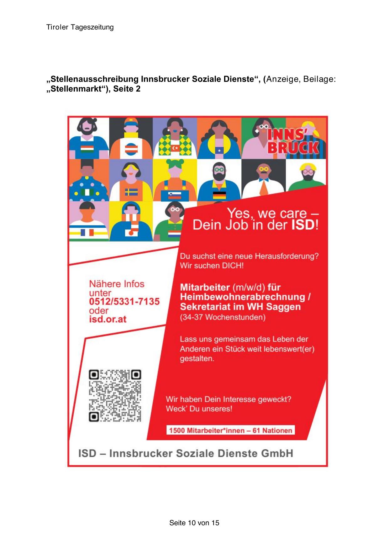 „Stellenausschreibung Innsbrucker Soziale Dienste“, (Anzeige, Beilage: