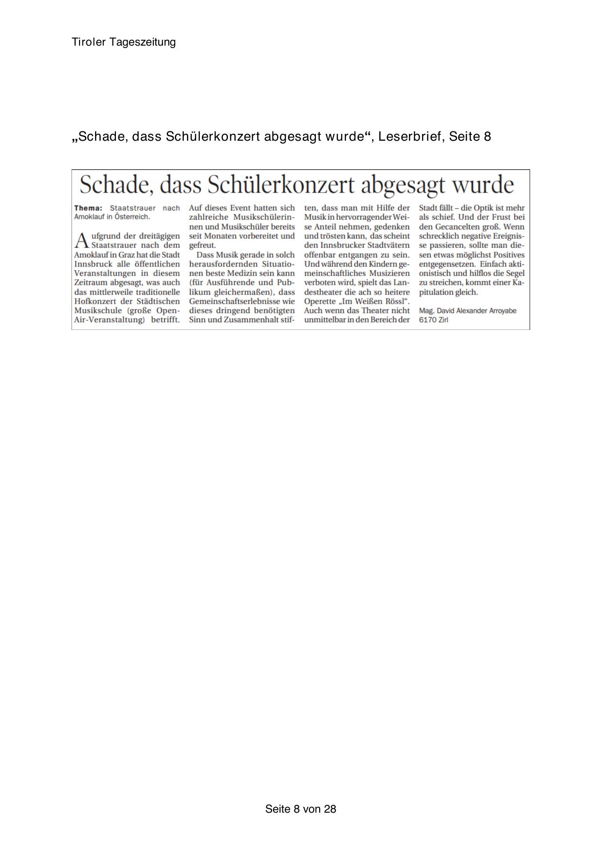 „Schade, dass Schülerkonzert abgesagt wurde“, Leserbrief, Seite 8