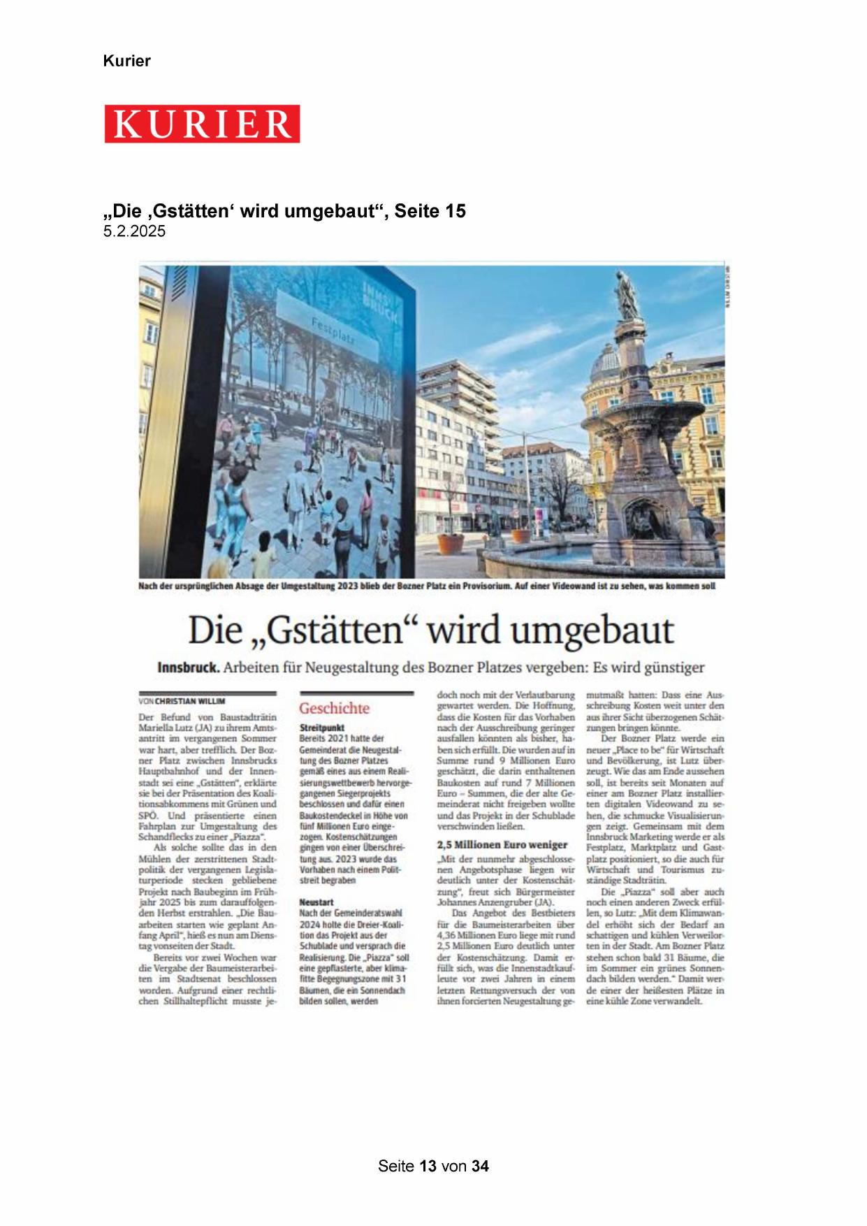 ner Piatz zwischen Innsbrucks tung des Bazner Platzes Summe rund 9 Millionen Euro und Bevölkerung, ist Lutz über