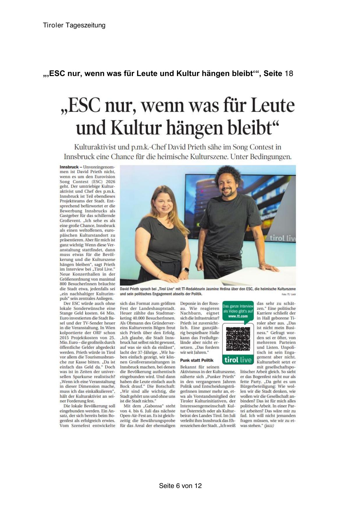 David Prieth sprach bei „Tirol Live“ mit TT-Redakteurin Jasmine Hrdina übét den ESC, die heimische Kulturszene
