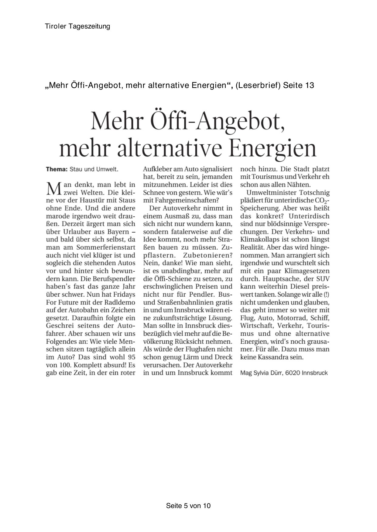 „Mehr Öffi-Angebot, mehr alternative Energien“, (Leserbrief) Seite 13