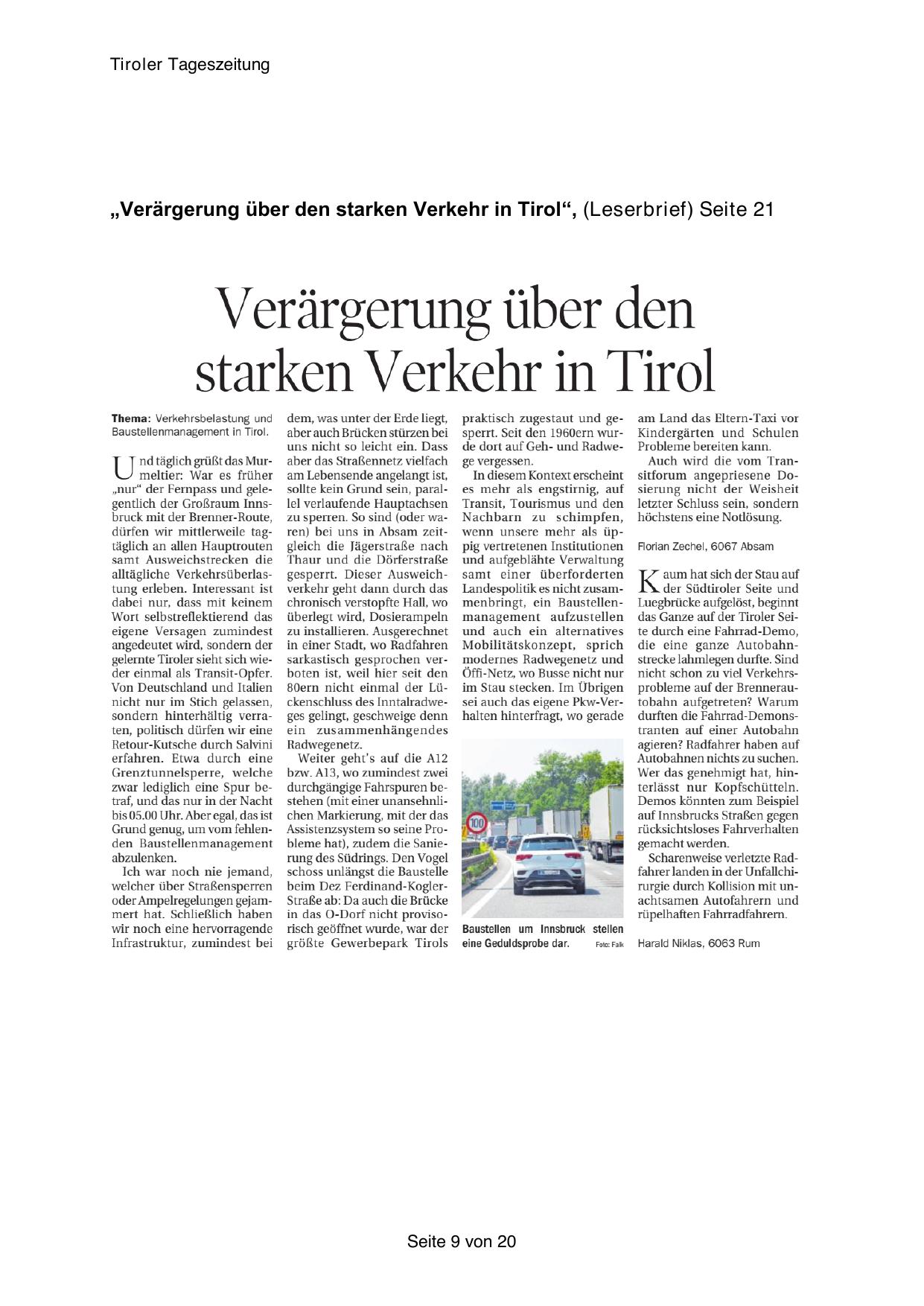 „Verärgerung über den starken Verkehr in Tirol“, (Leserbrief) Seite 21