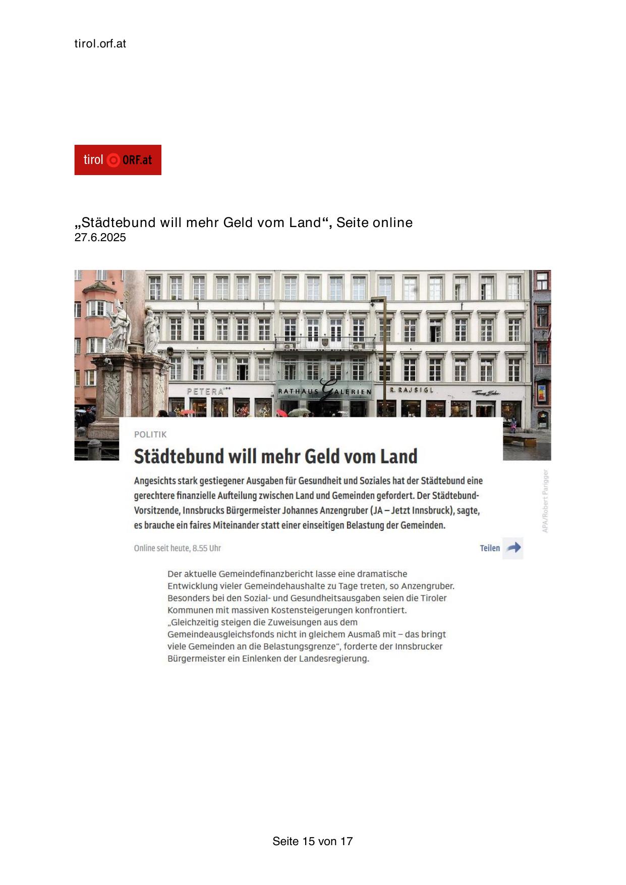 viele Gemeinden an die Belastungsgrenze“, forderte der Innsbrucker