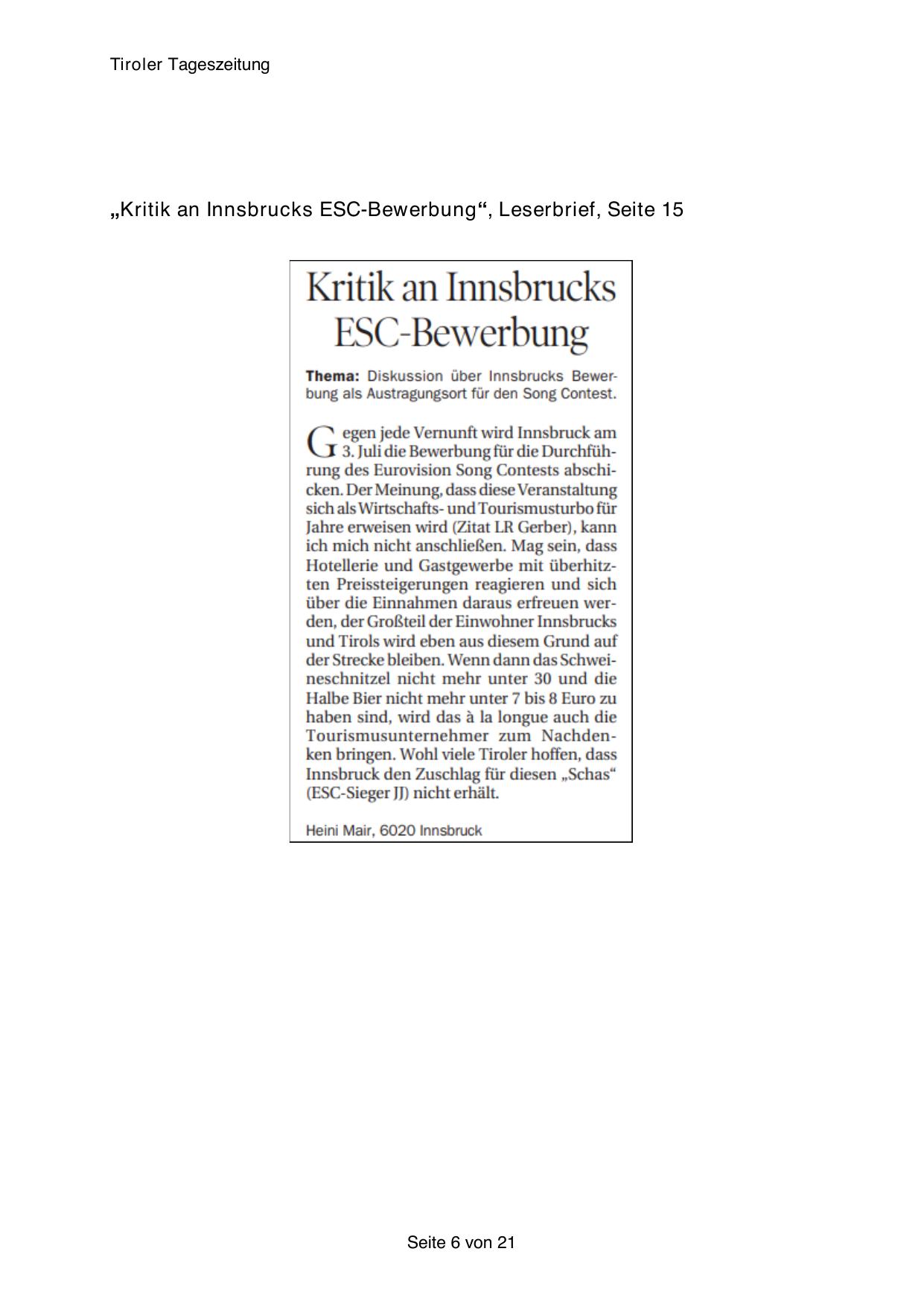 „Kritik an Innsbrucks ESC-Bewerbung“, Leserbrief, Seite 15