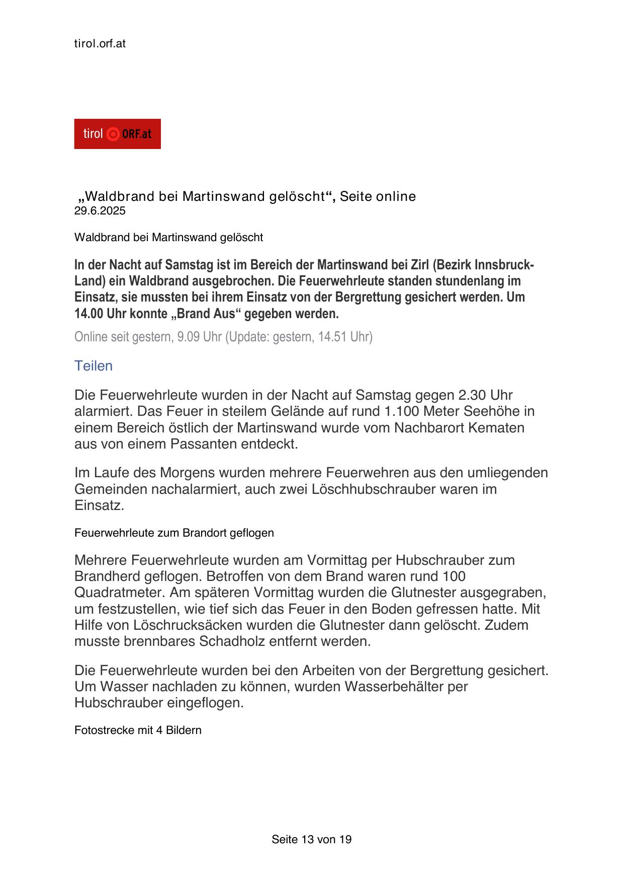 „Waldbrand bei Martinswand gelöscht“, Seite online