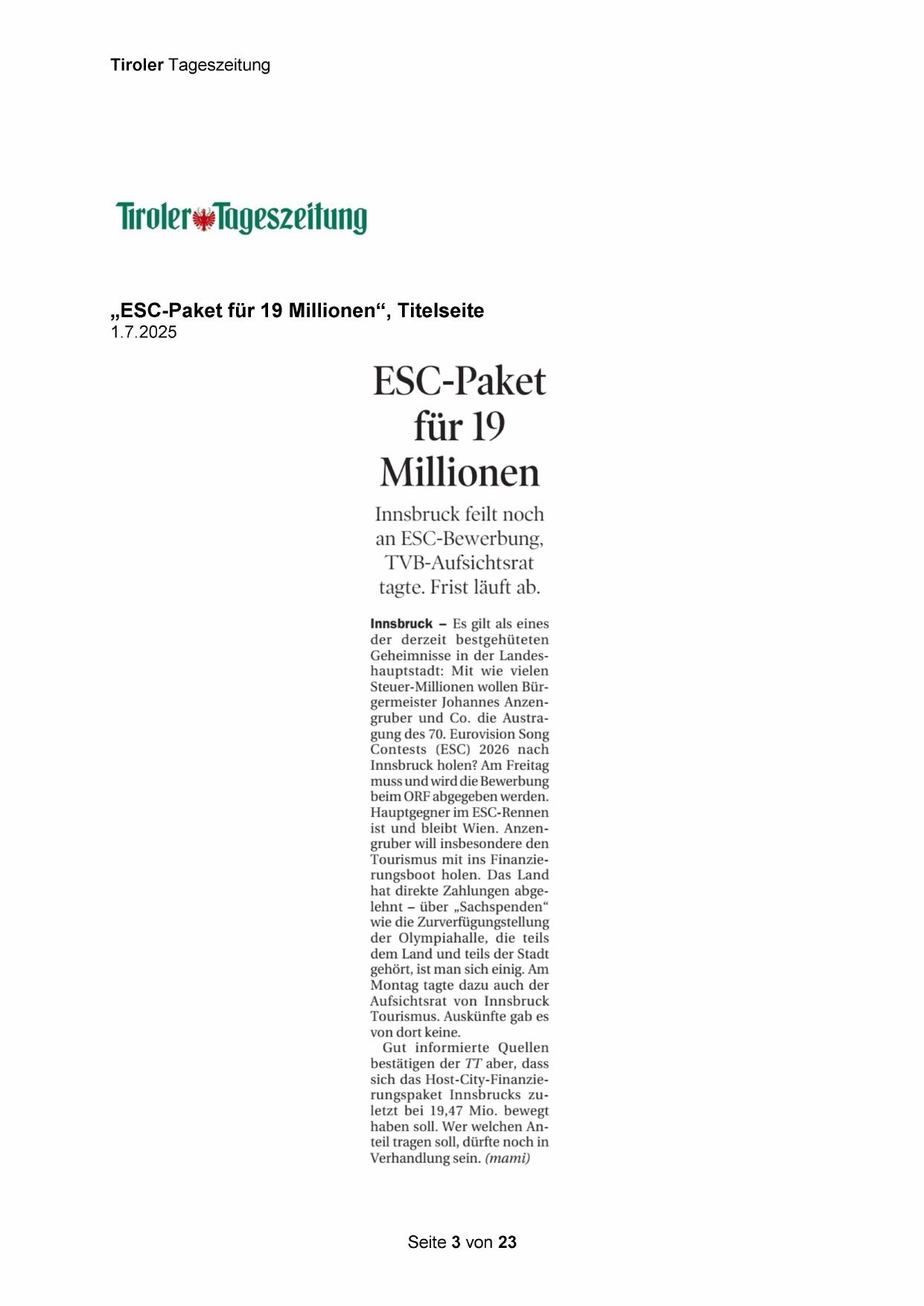 sich das Host-City-Finanzierungspaket Innsbrucks zuletzt bei 19,47 Mio. bewegt