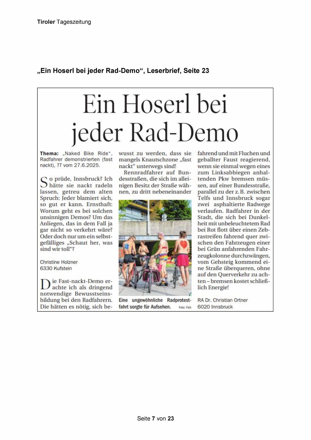„Ein Hoserl bei jeder Rad-Demo“, Leserbrief, Seite 23