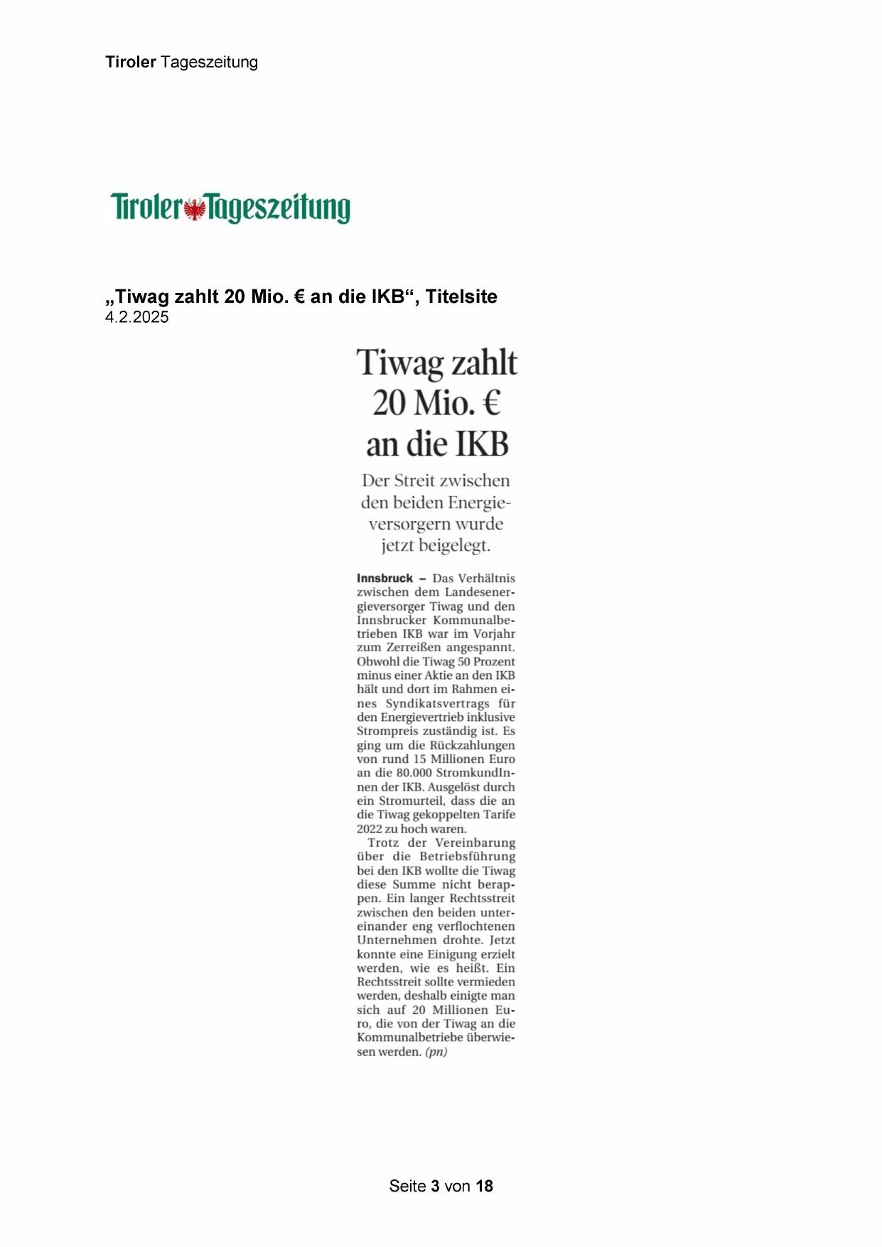 „Tiwag zahlt 20 Mio. € an die IKB“, Titelsite