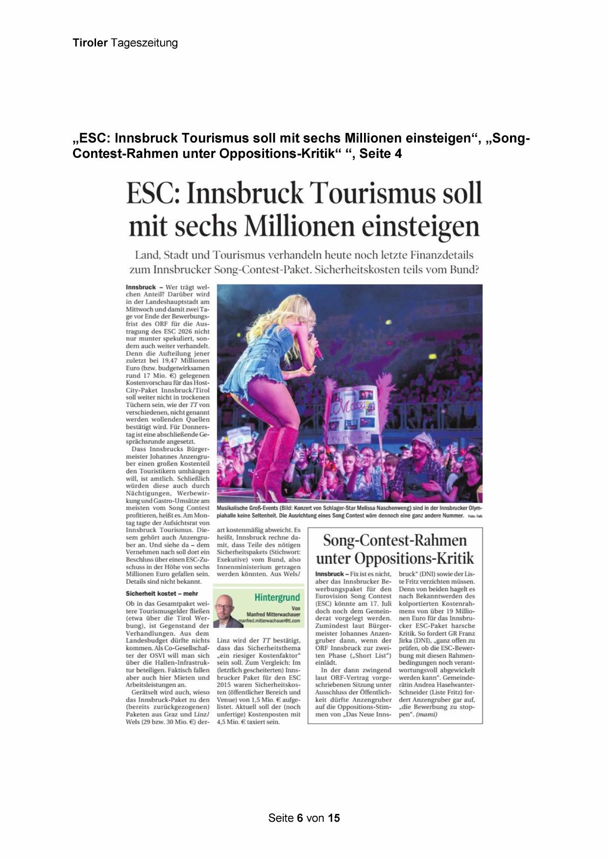 „ESC: Innsbruck Tourismus soll mit sechs Millionen einsteigen“, „Song-