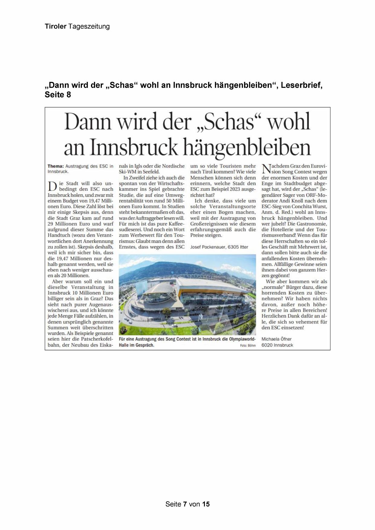 „Dann wird der „Schas“ wohl an Innsbruck hängenbleiben“, Leserbrief,