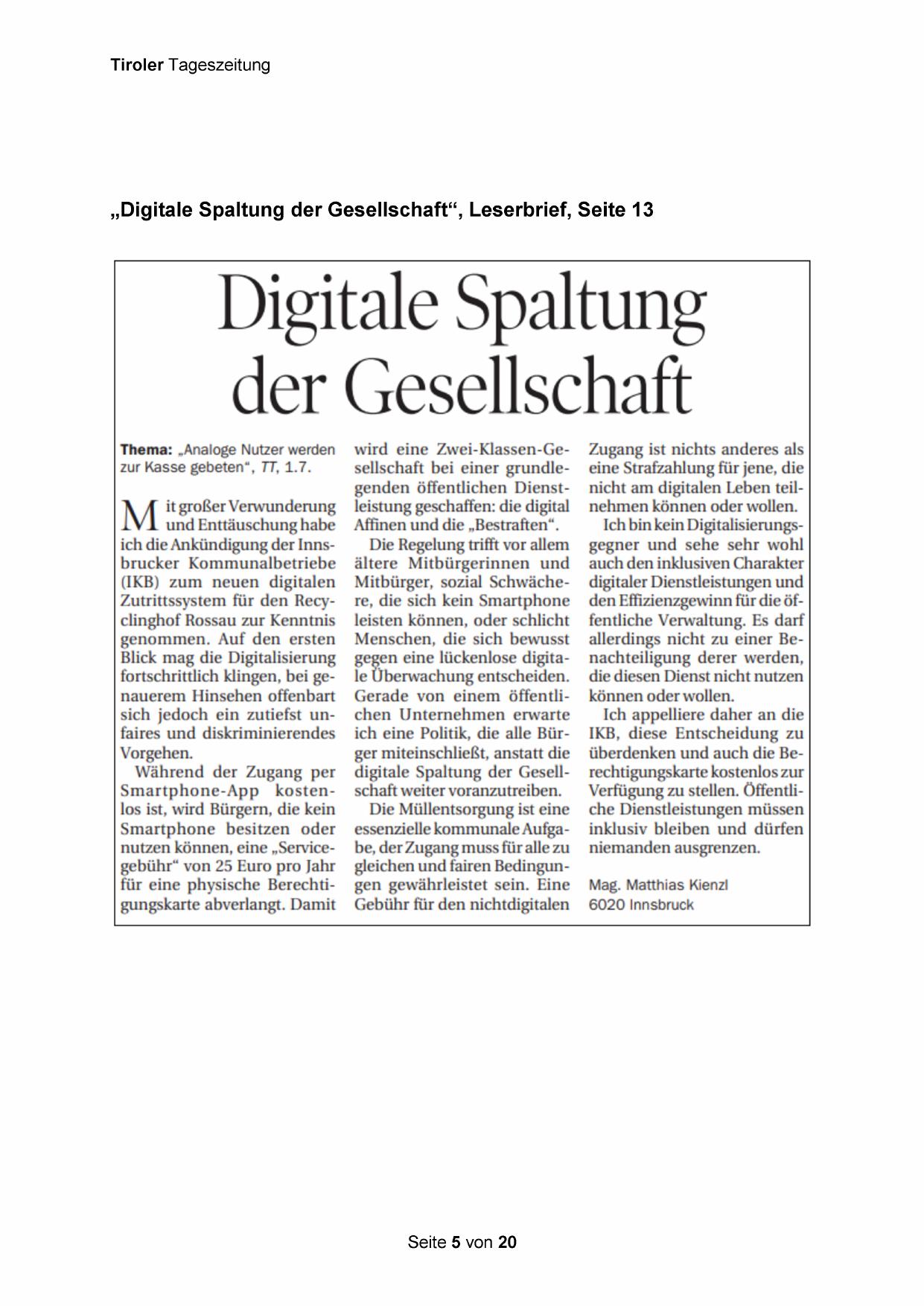 „Digitale Spaltung der Gesellschaft“, Leserbrief, Seite 13