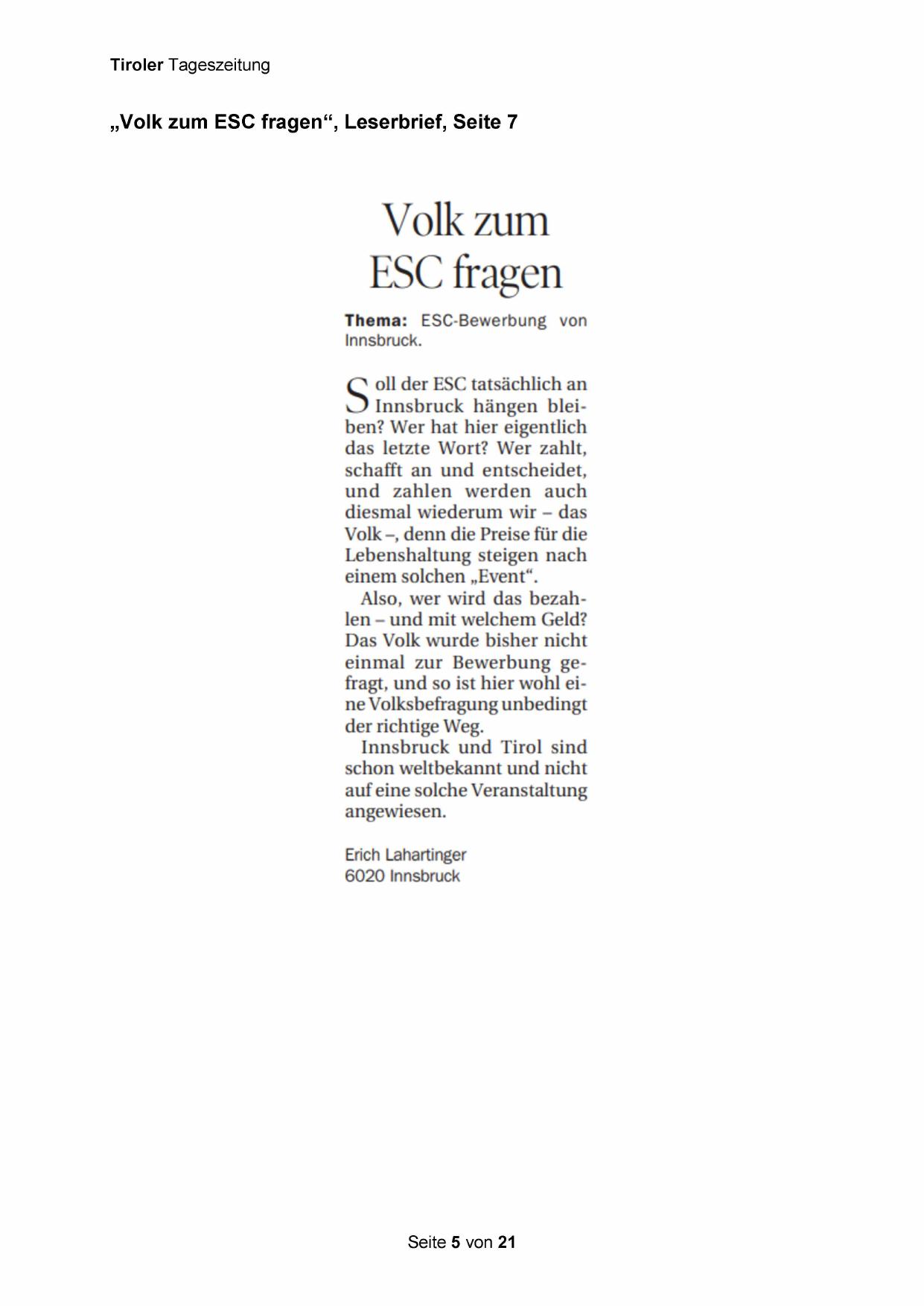 „Volk zum ESC fragen“, Leserbrief, Seite 7