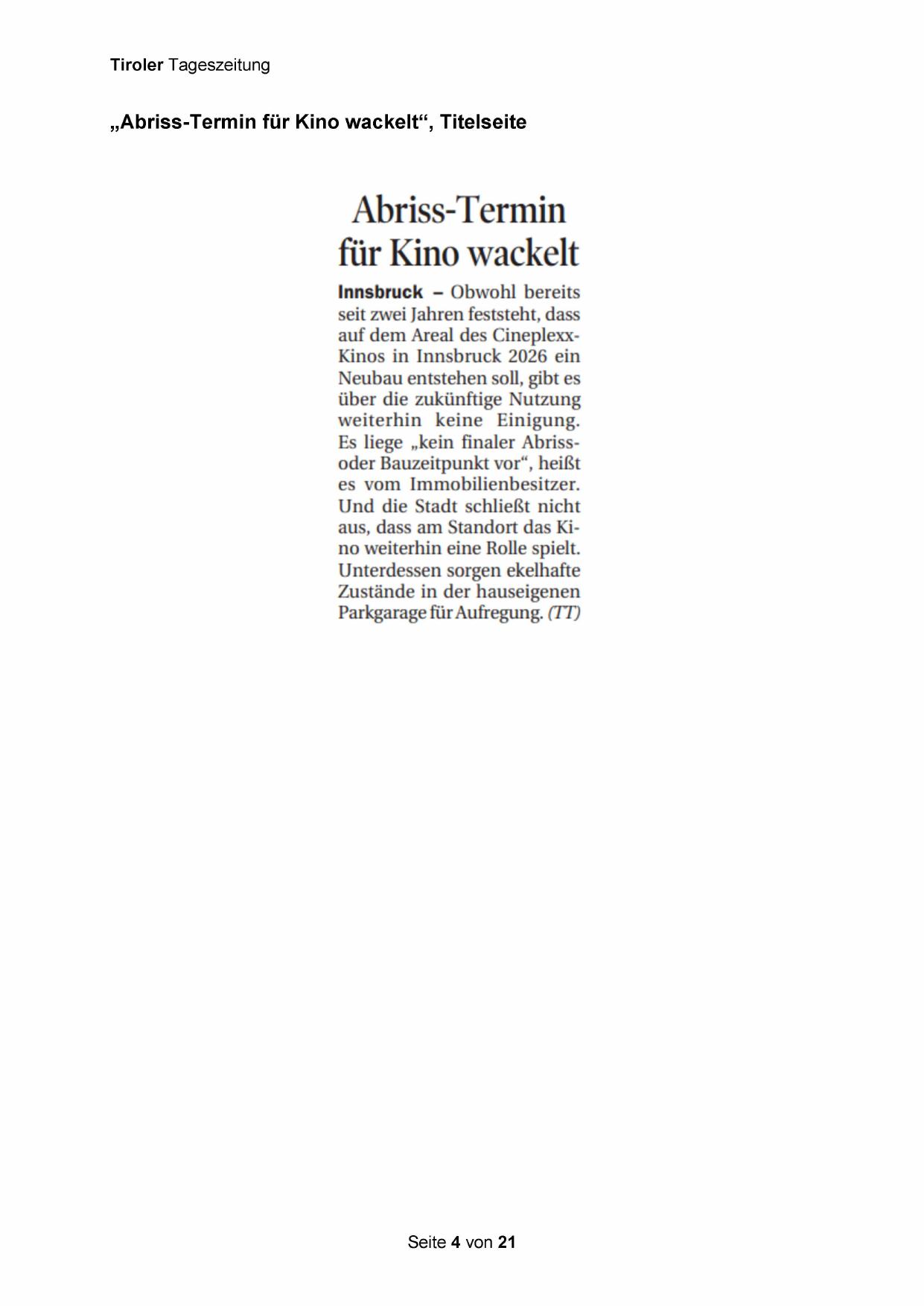 „Abriss-Termin für Kino wackelt‘“, Titelseite