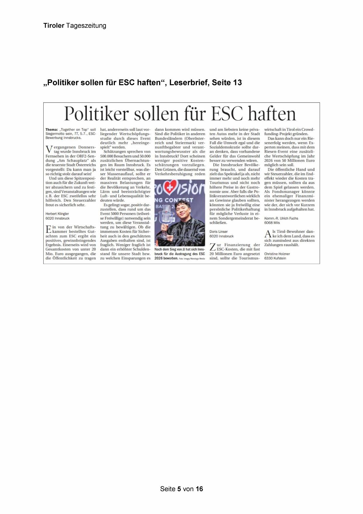 „Politiker sollen für ESC haften“, Leserbrief, Seite 13