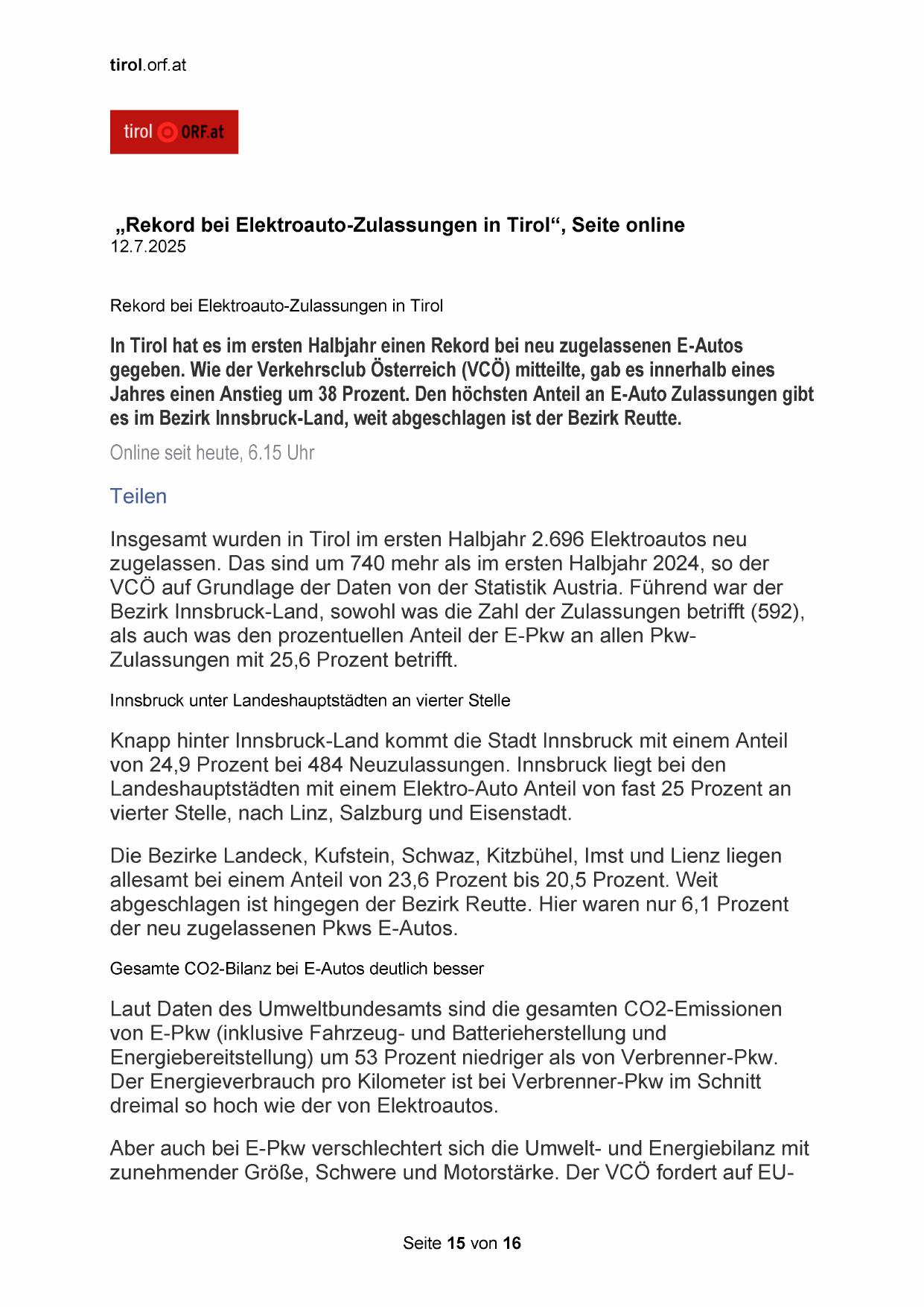 „Rekord bei Elektroauto-Zulassungen in Tirol“, Seite online