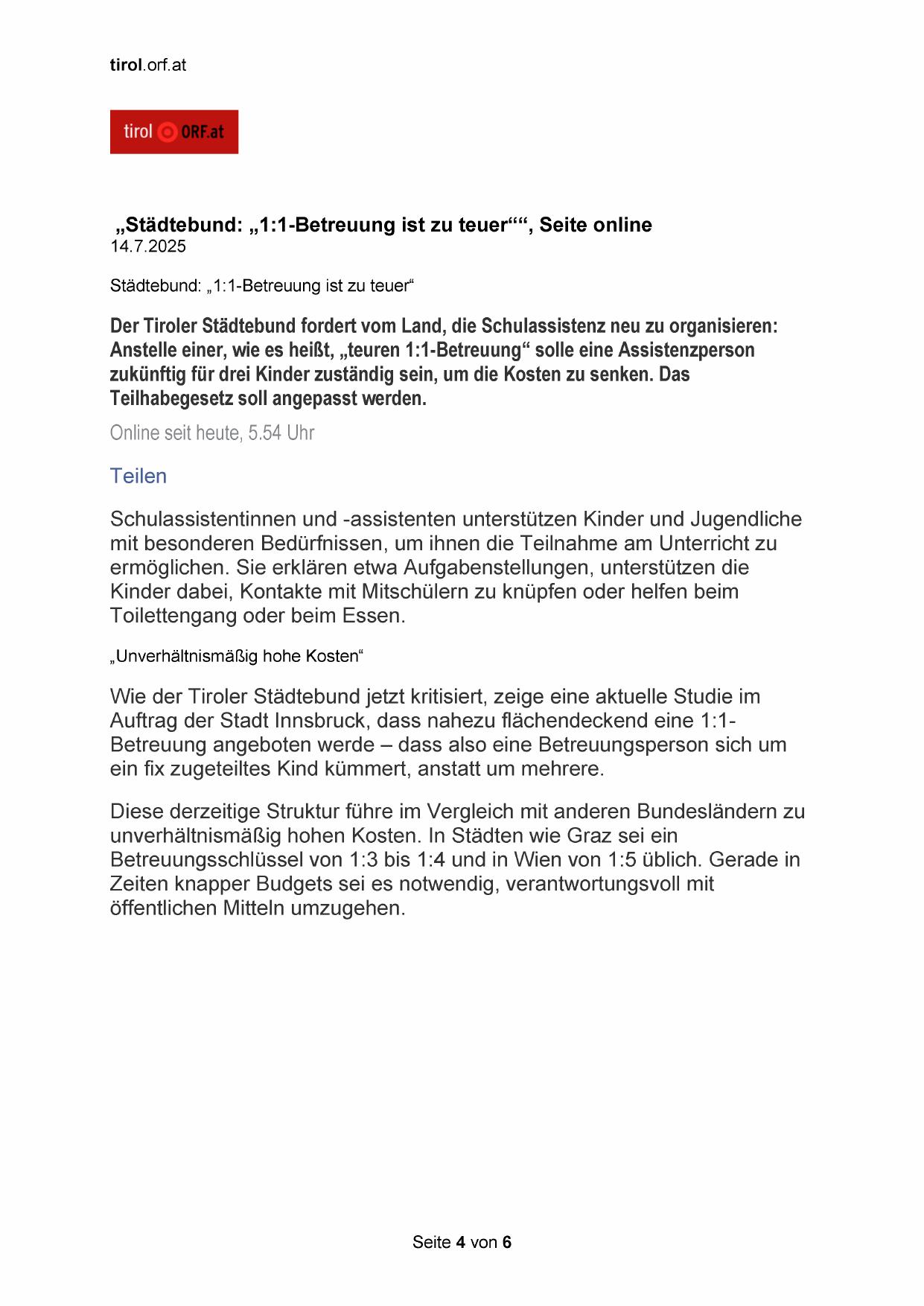 „Städtebund: „1:1-Betreuung ist zu teuer““, Seite online